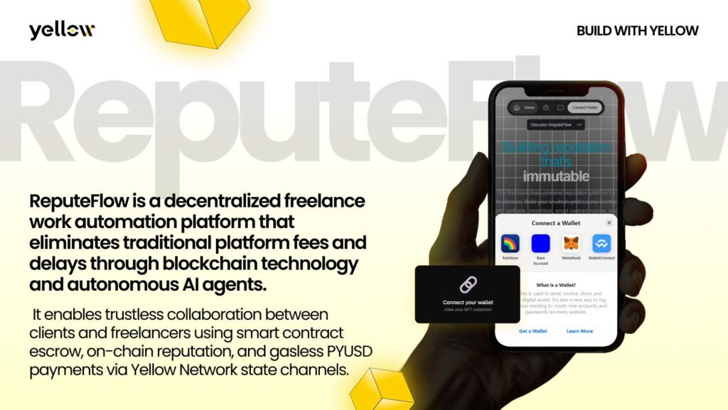 ReputeFlow has launched an innovative decentralized freelance work automation platform built on the Yellow SDK. This revolutionary approach eliminates traditional platform fees and payment delays by leveraging blockchain technology alongside autonomous AI agents. Deployed on the Base Sepolia testnet, ReputeFlow fosters a trustless collaboration environment between clients and freelancers through smart contract escrow and on-chain reputation systems.