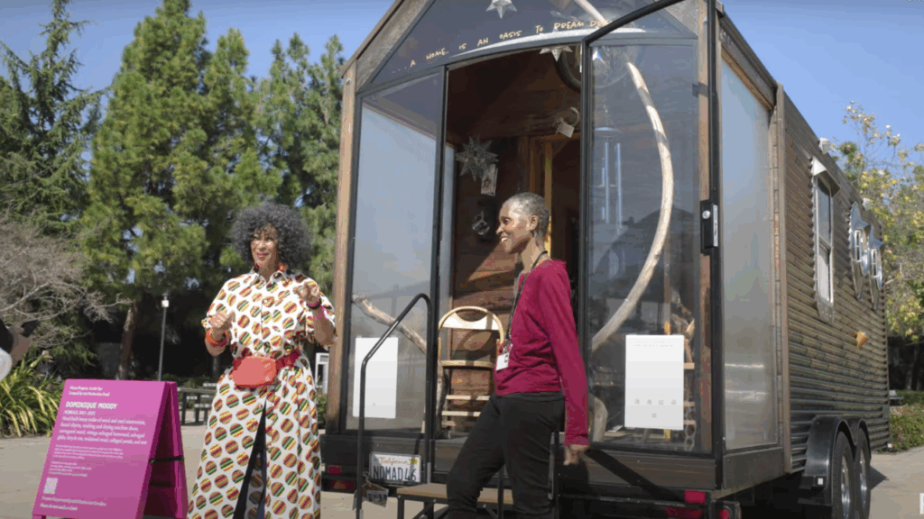 Dominique Moody describes Nomad as a temporary, interactive public artwork that invites engagement. Though it resembles a home, its mobility and smaller size offer a fresh perspective. What’s particularly unique about Nomad is how it conveys a profound narrative about personal and collective histories, connecting deeply with the community of Altadena.