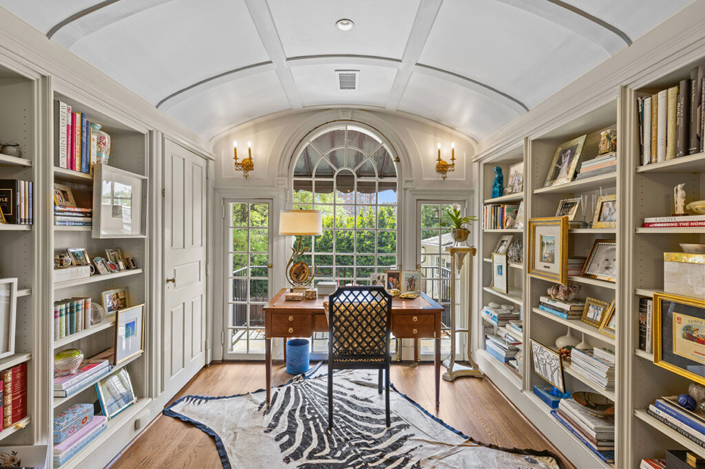 The elegant second-floor office in this beautifully renovated 1929 Colonial home, featuring Federal elements, showcases a barrel ceiling and floor-to-ceiling shelving. With five spacious bedrooms, the enchanting property boasts a modern kitchen equipped with Calacatta marble countertops and a top-of-the-line Wolf range.