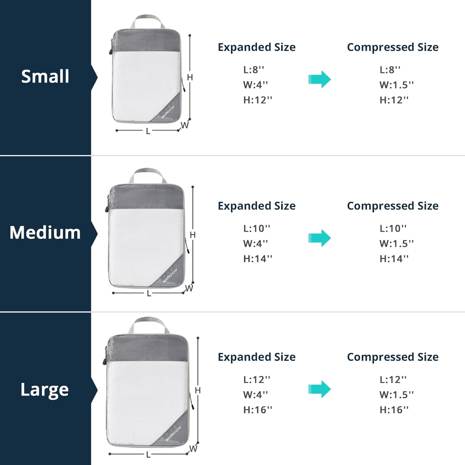Organize Like a Pro: These 6-set travel packing organizers contain 6 compressible packing cubes in 3 different sizes. These travel cubes also make it easy to keep luggage organized and tidy. Say goodbye to messy luggage and hello to anti-stress packing