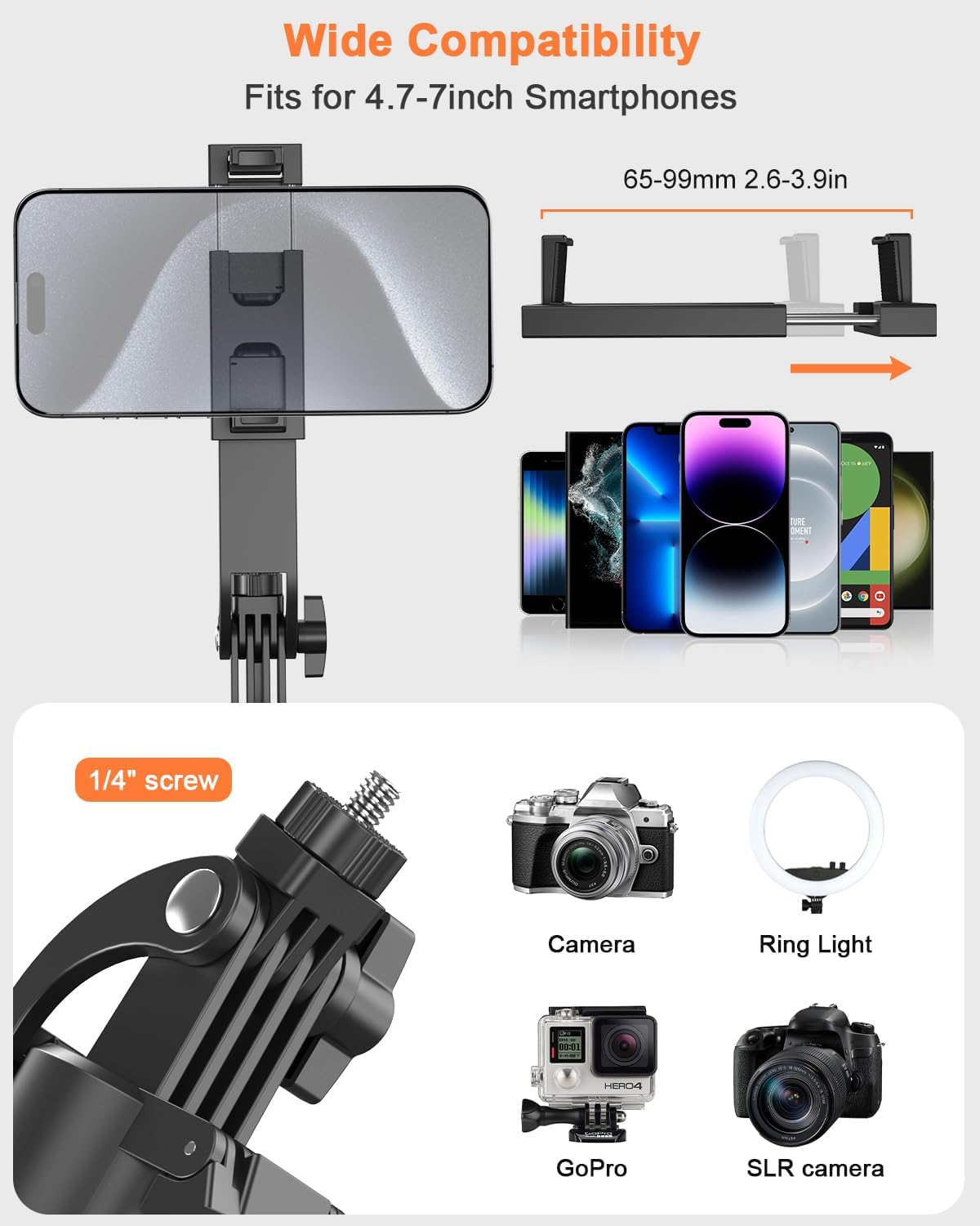 【Multi-Angle Adjustment and Wide Compatibility】 This phone tripod with light offers versatile 360° rotating head, 270° tilt angle, and a 360° balanced handle, allowing you to effortlessly find the ideal shooting angle. Additionally, the integrated 1/4″ screw supports cameras, GoPros, and ring lights, while the flexible phone holder accommodates devices with screen sizes from 4.7 to 7 inches, ensuring seamless compatibility with both iPhone and Android devices