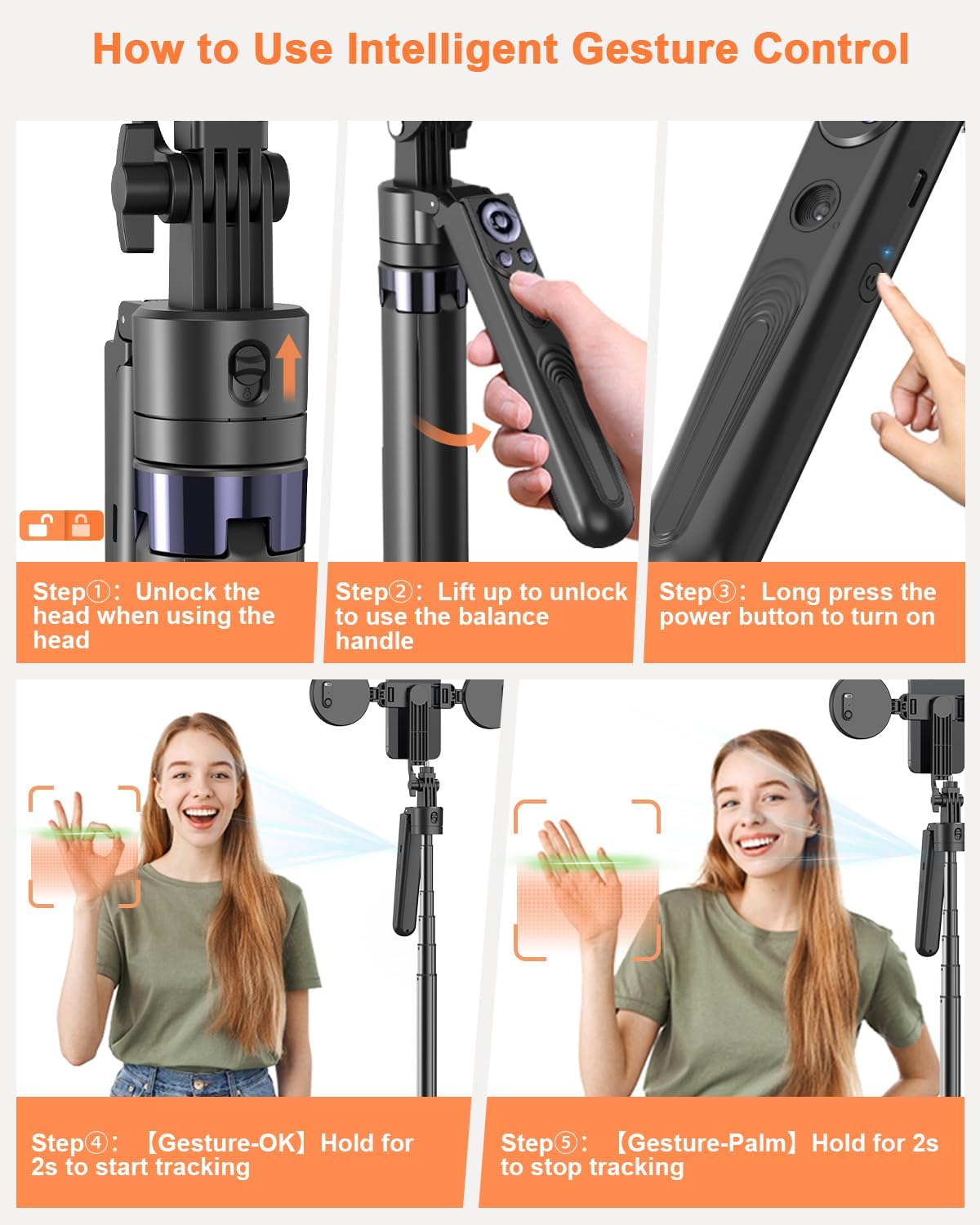 【Auto Face Tracking Tripod 360 Rotation with stand】 Our selfie stick for iPhone features advanced 360° automatic face tracking. Just press the lock button on the back, and it will automatically recognize and lock onto your face. With intuitive gesture controls, a wave of your hand with “OK” starts tracking, while the “Palm” gesture stops it, ensuring you stay in focus for every shot