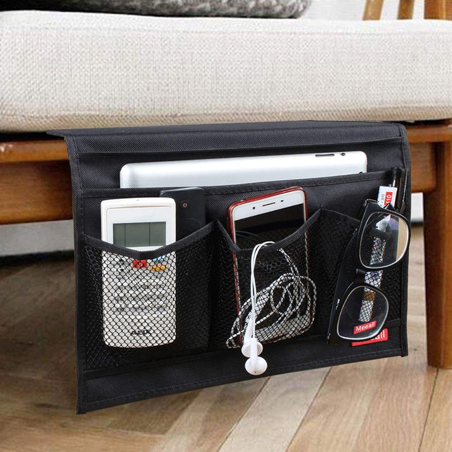 3 mesh pockets and 1 large pocket. Easy to install, insert the leather between your mattress and bed frame