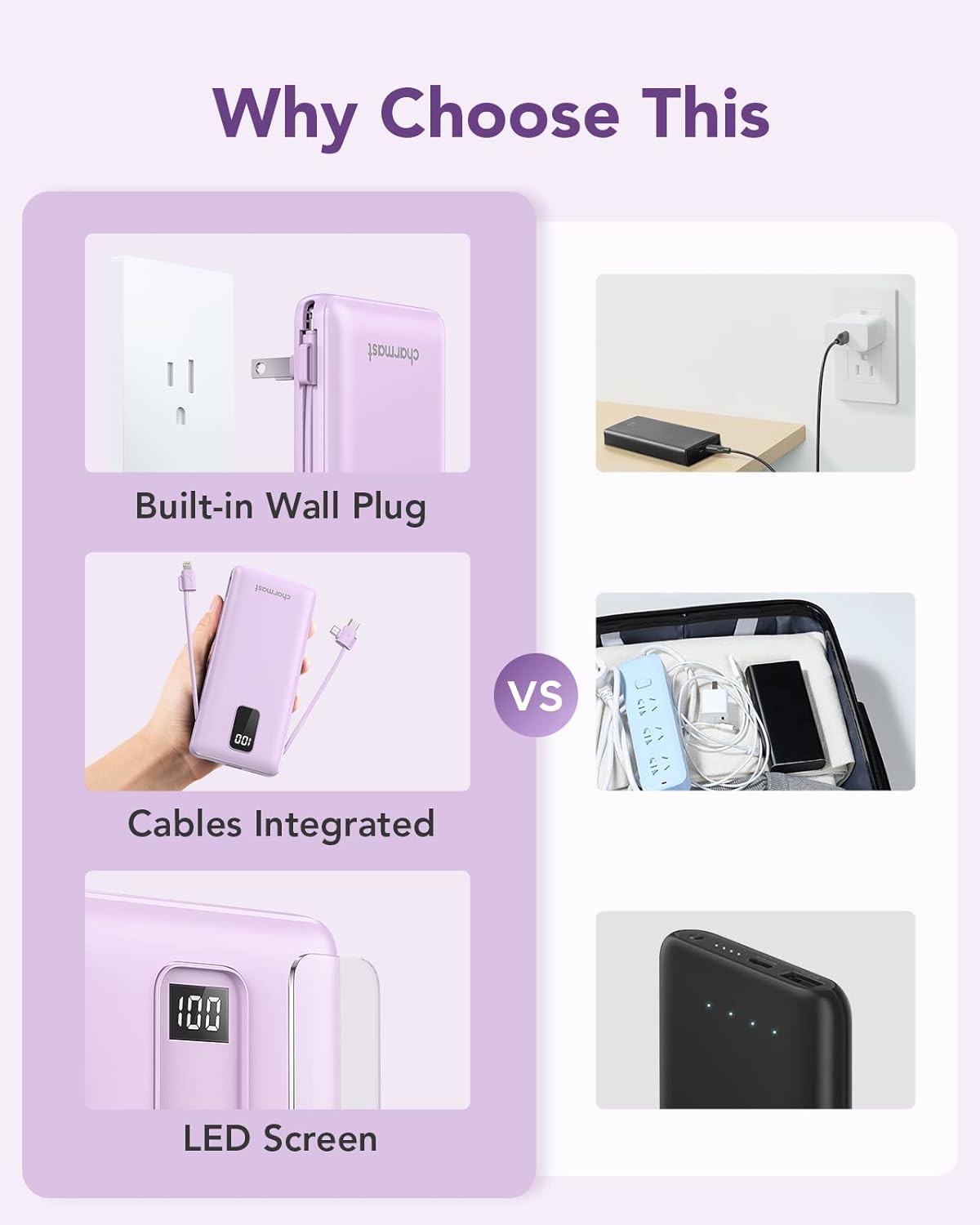 【3 Cables + Plug Built-In】Zero Accessory Design: Integrated USB-C/Micro/ cable for old iPhones, + foldable AC plug. The only most powerful portable charger you need, no separate cables/adapters to carry.
