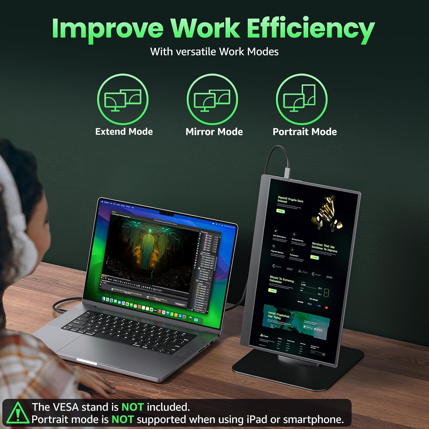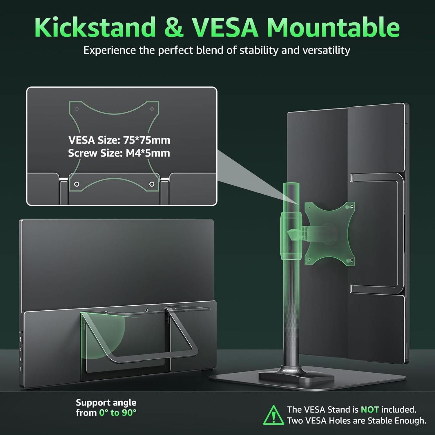 Adjustable Stand and VESA Mountable: Cocopar portable computer monitor setup with ease. The 90° adjustable integrated kickstand lets you personalize the position and angle. Plus, the 2 VESA holes enable stable mounting on compatible stands for efficient space utilization. Customize your workspace for enhanced productivity