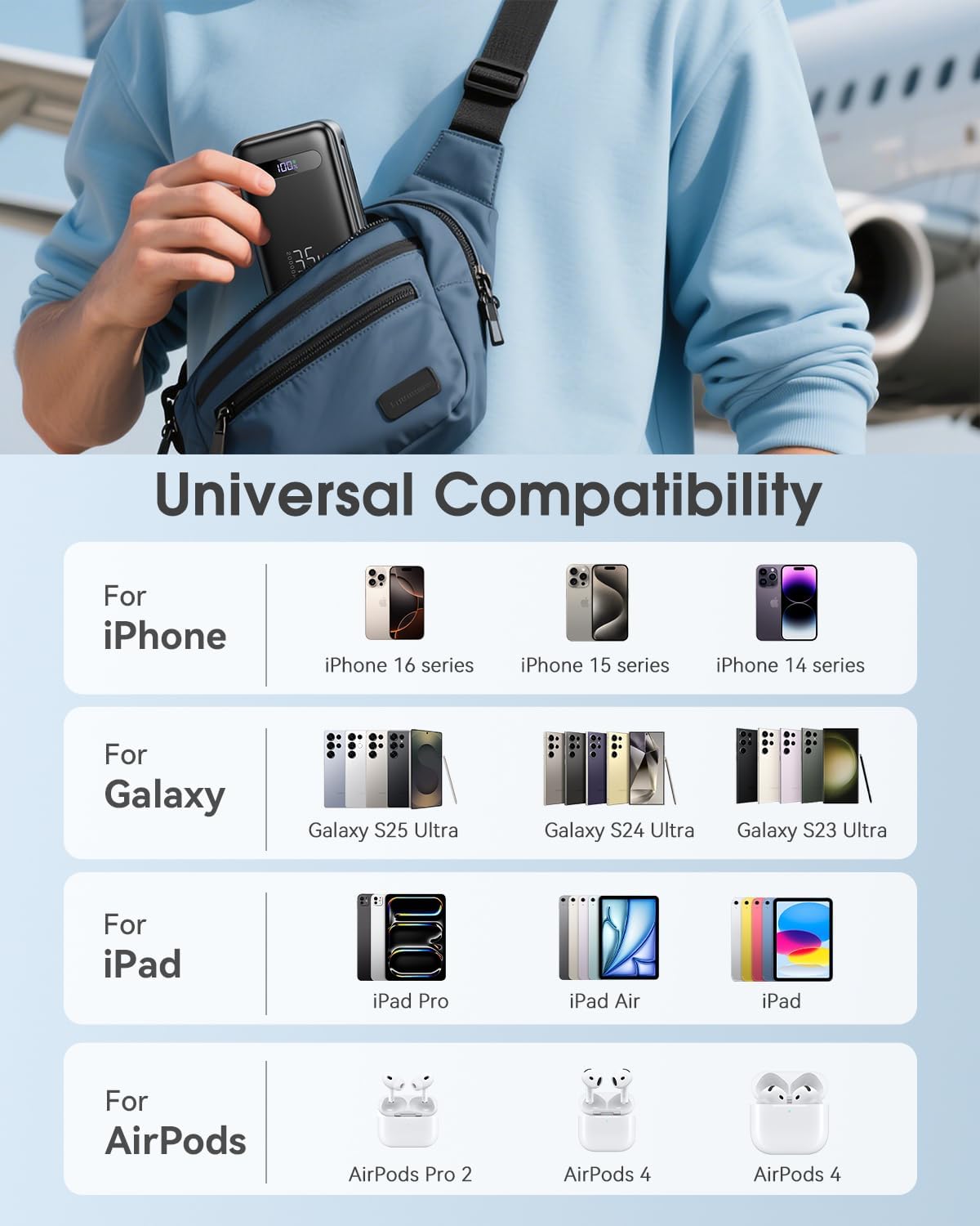 35W Ultra-Fast Charging Power Bank : Stop waiting around for a charge!Our advanced 35W PD3.0 & QC4.0 technology delivers incredible charging speeds: revive your iPhone 16 to 60% or your Samsung Galaxy S24 to 58% in just 30 minutes—noticeably faster than standard 15W-30W power banks. Perfect for busy days and travel.