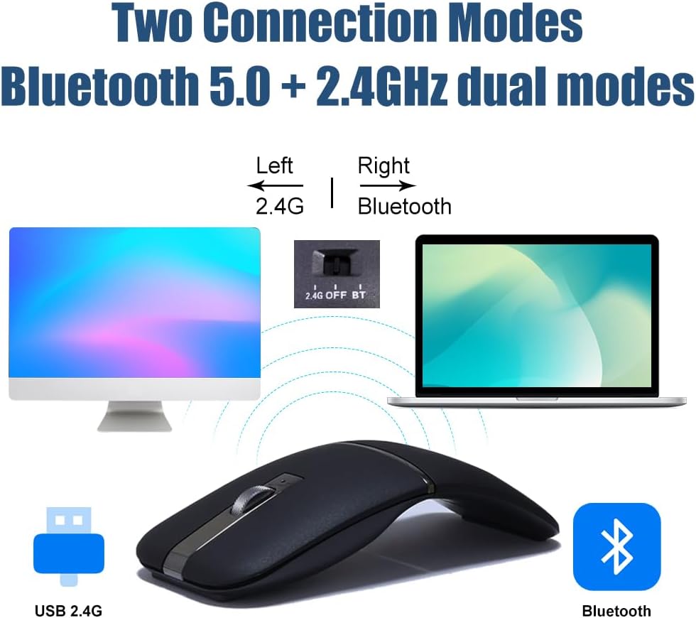 2.4GHz & Bluetooth 5.0 dual mode: This creatively and conveniently designed mouse,can work on TWO DEVICES, connecting one device through Bluetooth and the other via RF 2.4Ghz. If you are annoying that you have to own one Bluetooth mouse and one 2.4G wireless mouse separately for your laptop and tablet, or laptop and laptop, or laptop and desktop, this mouse is your ideal choice. You could intelligently switch the mode between both devices just by a click