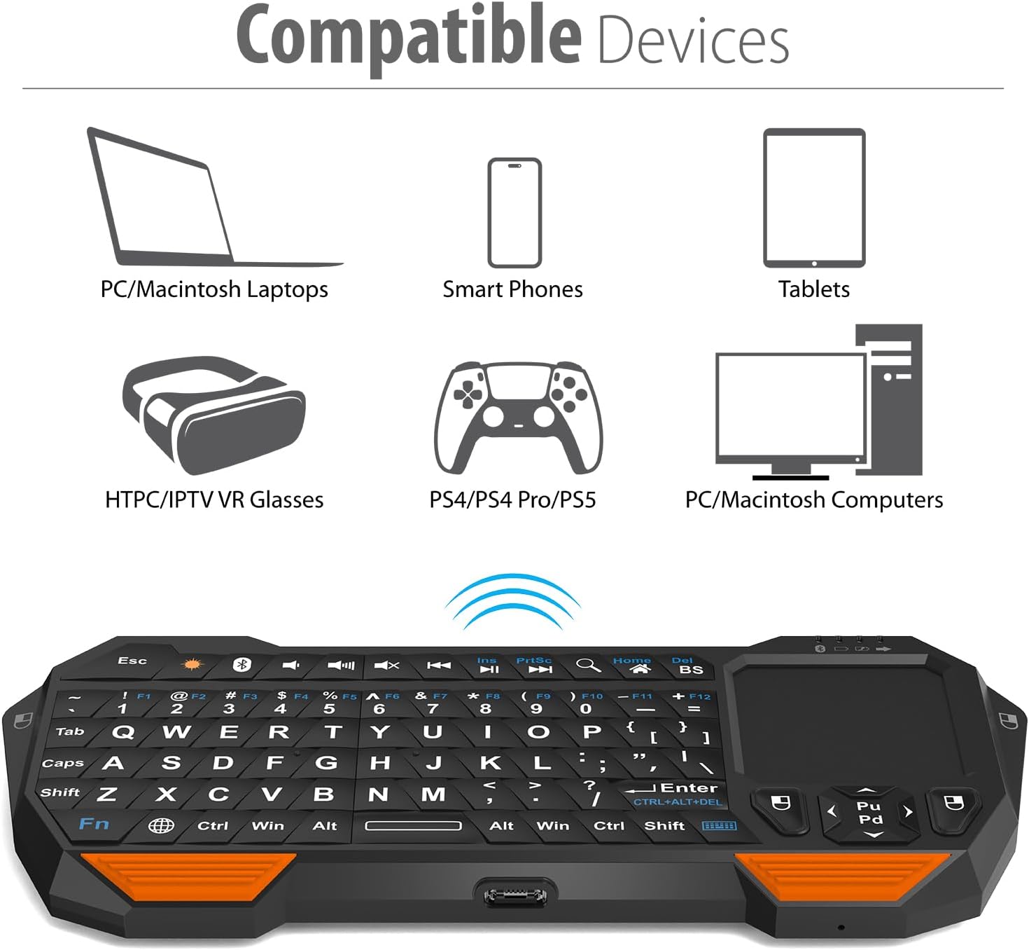 Compact and Portable QWERTY Keyboard with Touchpad: Innovative and compact QWERTY keyboard with touchpad that provides comfort combined with the freedom of wireless connectivity. Connect to all of your favorite devices with this wireless keyboard. This controller gives you everything you need right in the palm of your hand. Navigate the cursor easily with your thumb without having to touch your screen, mouse or keyboard.