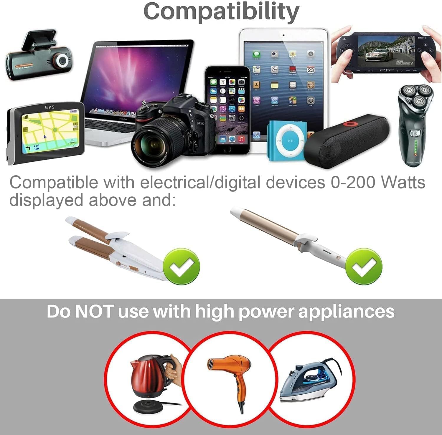 Safe to Use: Certified by CE, FCC and RoHS industry standard. WARM TIPS: Only provide for under 230W power electronic equipment to use. Please don’t use this power converter for supplying power to your hair dryer, electric heaters.
