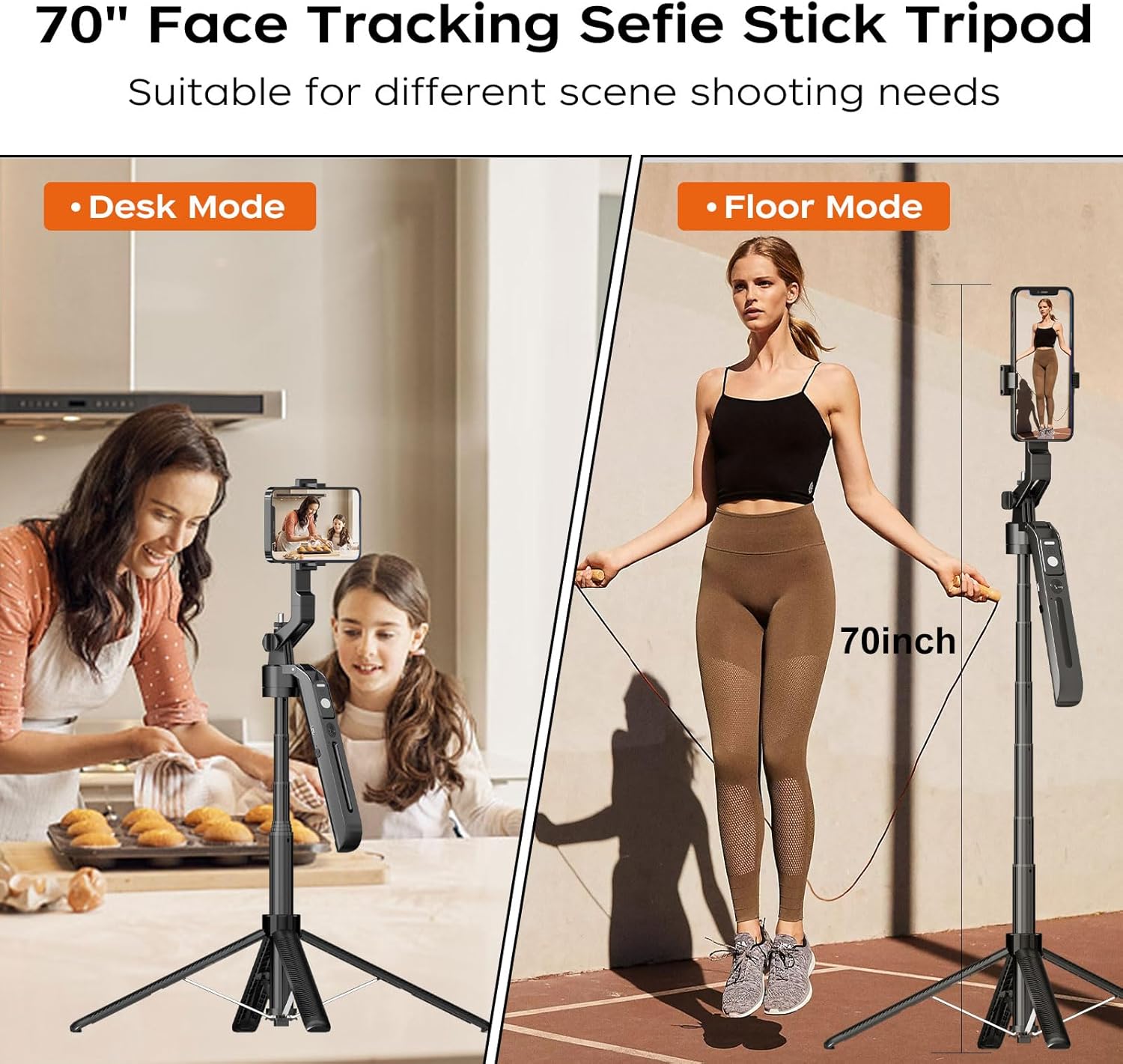 {70” Selfie Stick Tripod & Adjustable Angles } The auto face tracking features 360°phone holder design that supports both horizontal and vertical clamping of mobile phones. Also, Adjustable length from 12.68 to 70.86, free your hands for video recording or live streaming.