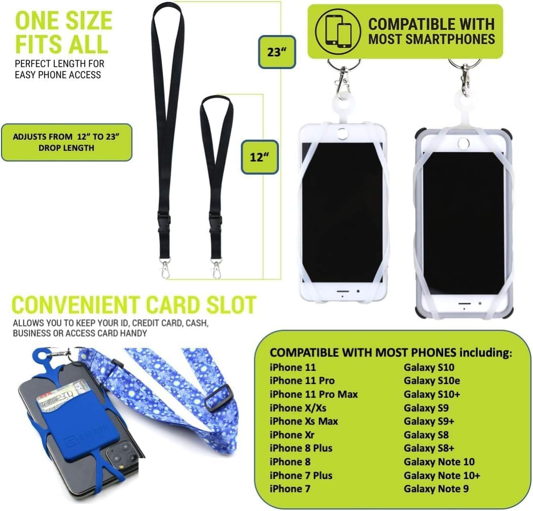 Universal Smartphone Lanyard Strap keeps your phone secure and accessible at all times. The perfect solution for sports fans, concert goers, teachers, students, hikers, seniors, travelers or anyone who wants easy access to their cell phone.