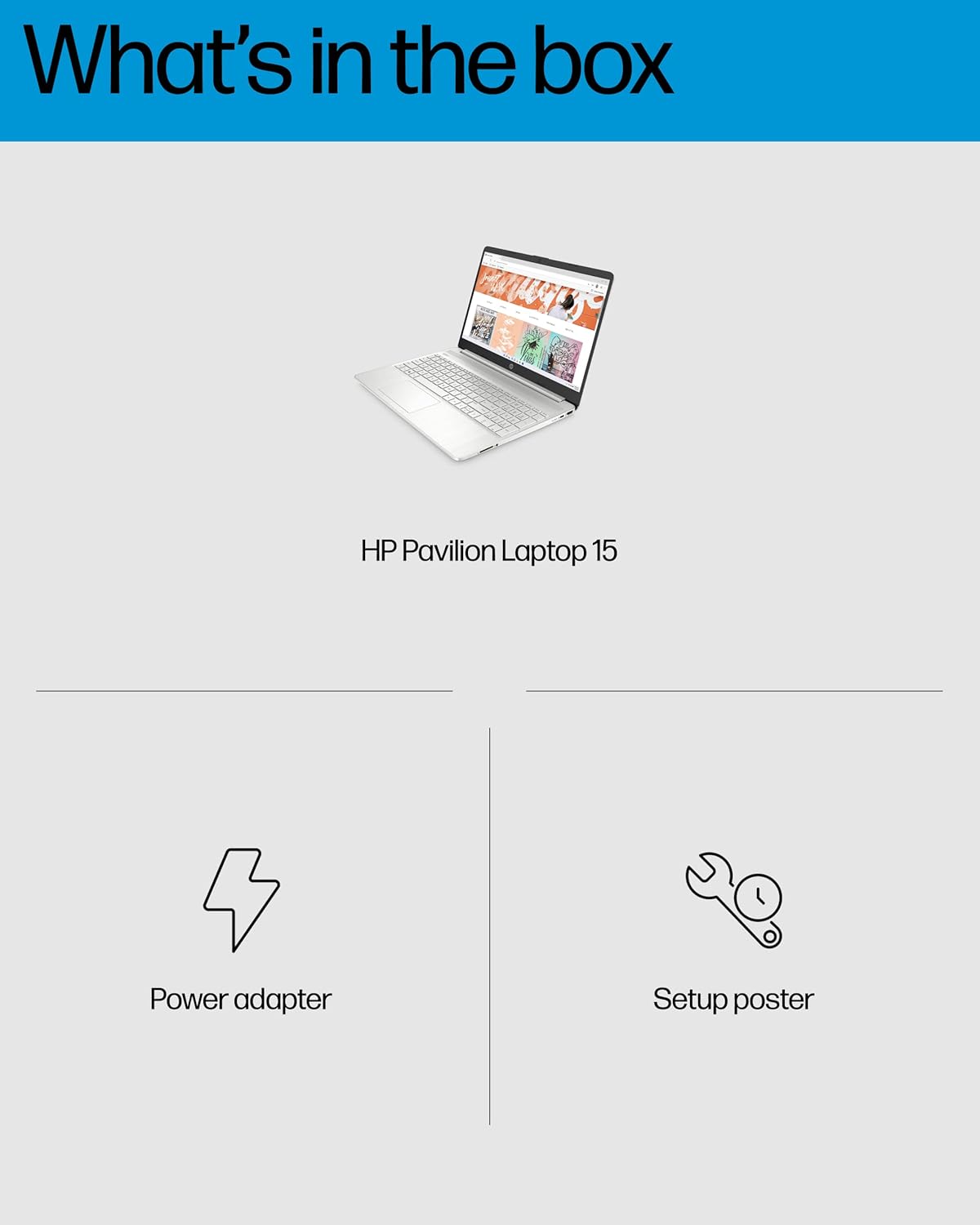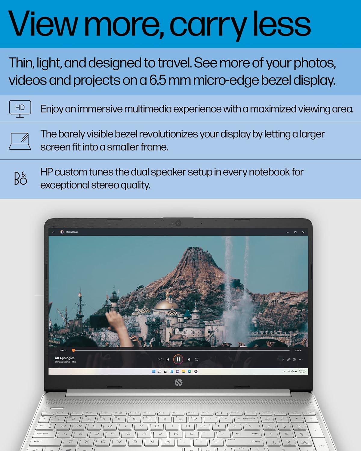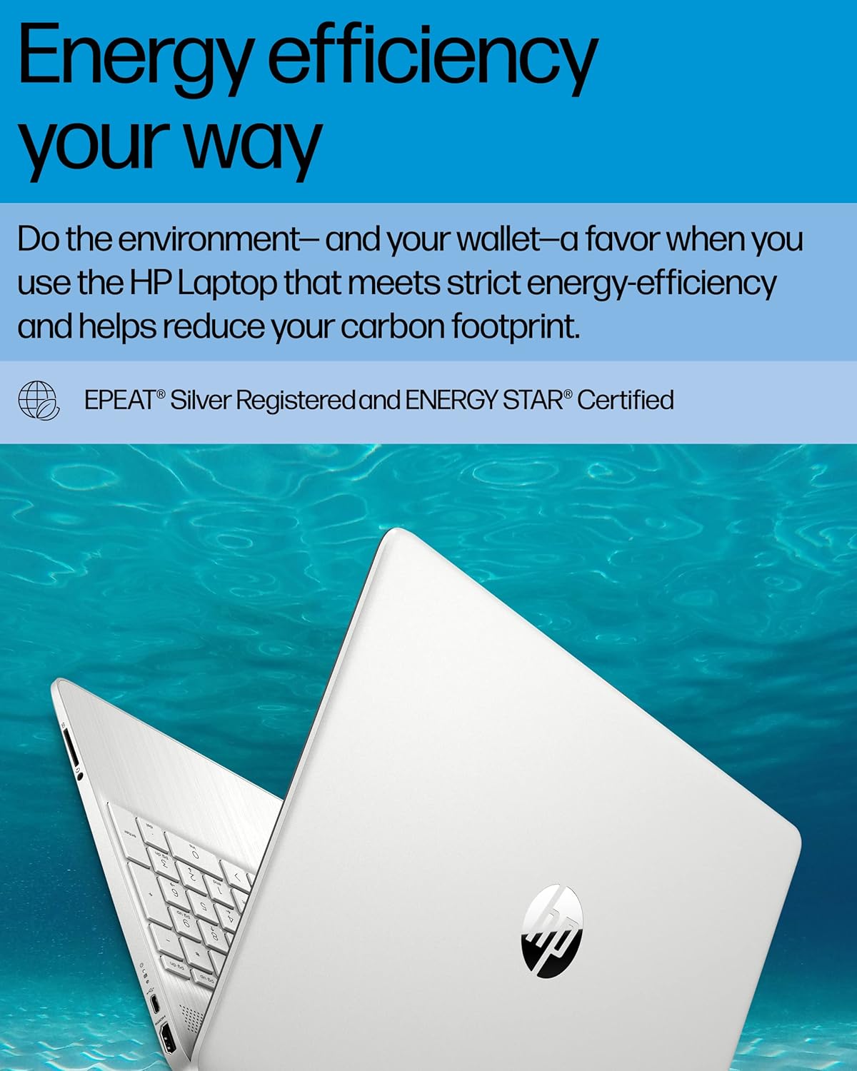 Power through any assignment, stream your favorite content, and compute on the go with the HP 15.6-inch Laptop. Be immersive and see more of your photos, videos, and projects on a 6.5 mm micro-edge HD display (1). Enjoy the computing power and battery life you need for all your modern apps and services with an AMD Ryzen™ 7 5700U mobile processor (2) and AMD Radeon™ Graphics (3). Get the storage space and bandwidth you crave with 256 GB PCIe® NVMe™ M.2 SSD storage (4) (5) and 8 GB of RAM. Long-lasting battery life and HP Fast Charge technology work in tandem so you can work, watch, and stay connected all day (6) (7). This Windows 11 laptop offers new ways to connect with your favorite people, express yourself, or interact with your content (8). You’ll also remain reliably connected, even while on the go, with a Wi-Fi 6 (1×2) (9) and Bluetooth® 5.2 combo (10). Additionally, your HP notebook laptop is covered by a 1-year limited warranty. Enjoy an elevated experience as the HP 15.6 Laptop is made for more than just power. Video conference in high fidelity with an HP True Vision 720p HD camera (11), dual-array microphones with advanced noise reduction, and custom-tuned dual speakers. Work comfortably with more finger space on this full-sized keyboard. Plus, up your productivity and navigation speeds thanks to this keyboard’s HP Imagepad with multi-touch gesture support. Going above and beyond traditional laptop computers—HP crafted this Windows laptop to be ENERGY STAR® certified (12) and EPEAT® Silver registered (13).