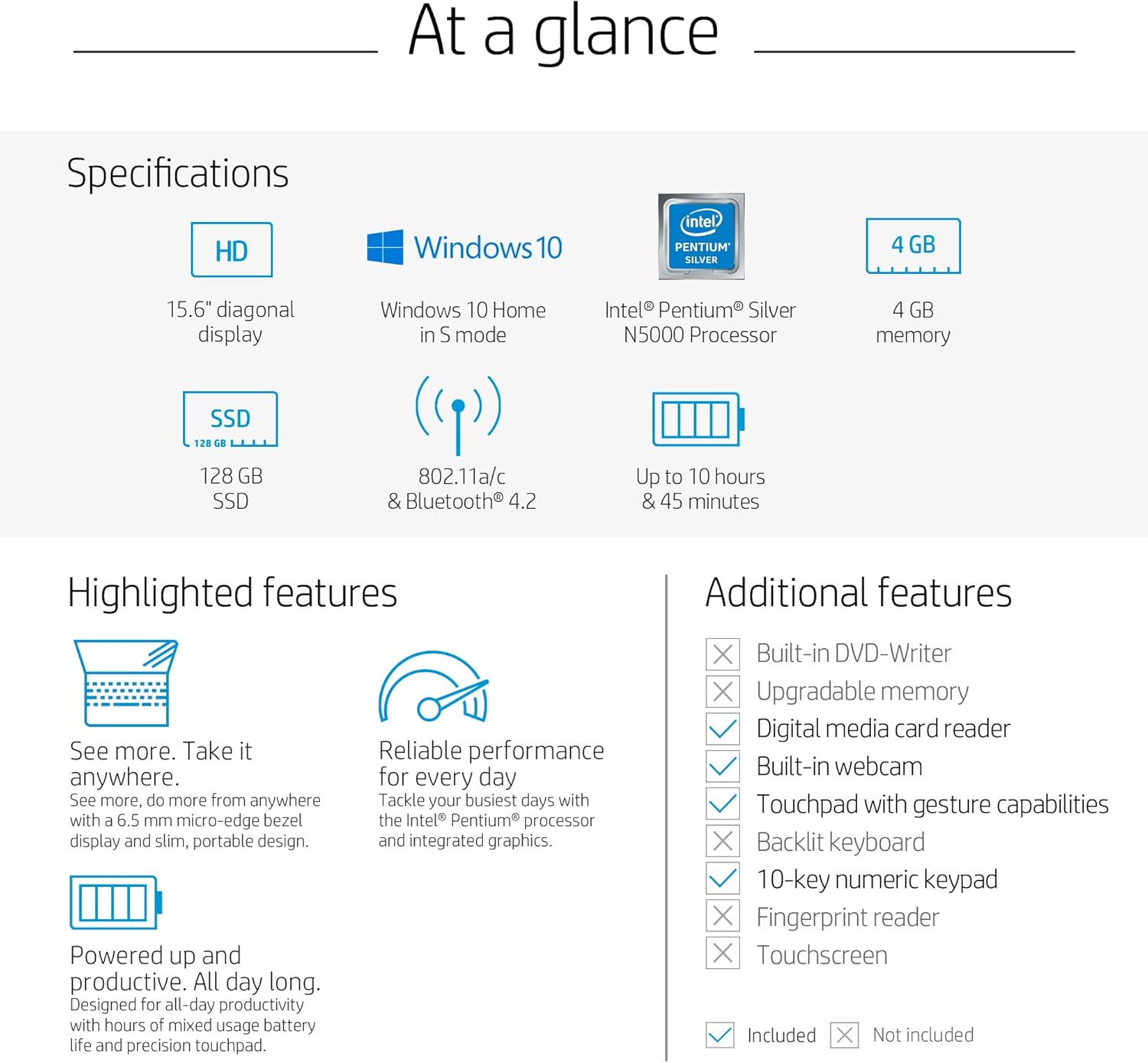 HP 15.6in Laptop (Intel Pentium Quad-Core N5000, 4GB RAM, 128GB SSD, HDMI, WiFi, Bluetooth, HD Webcam, Windows 10 S