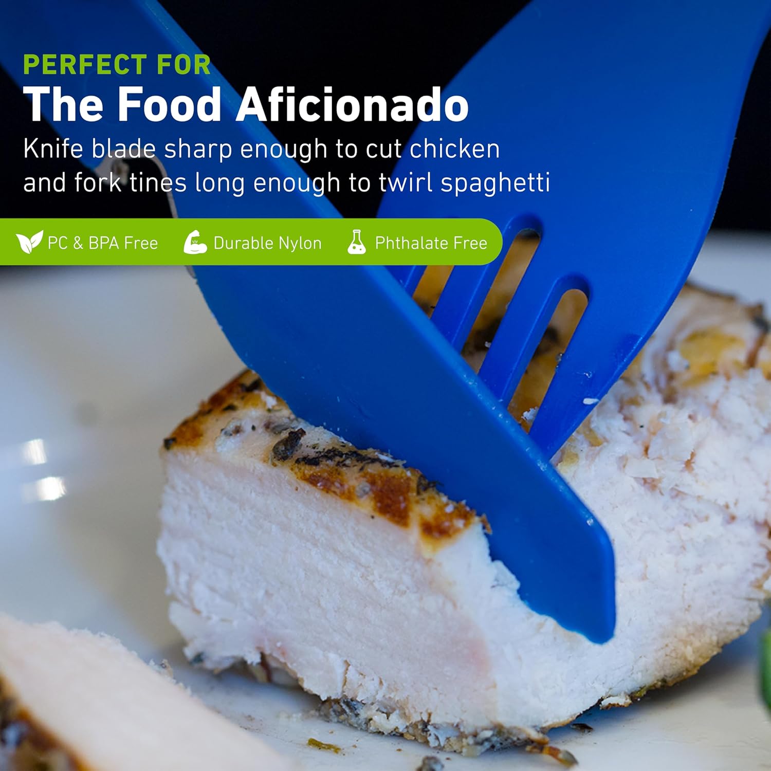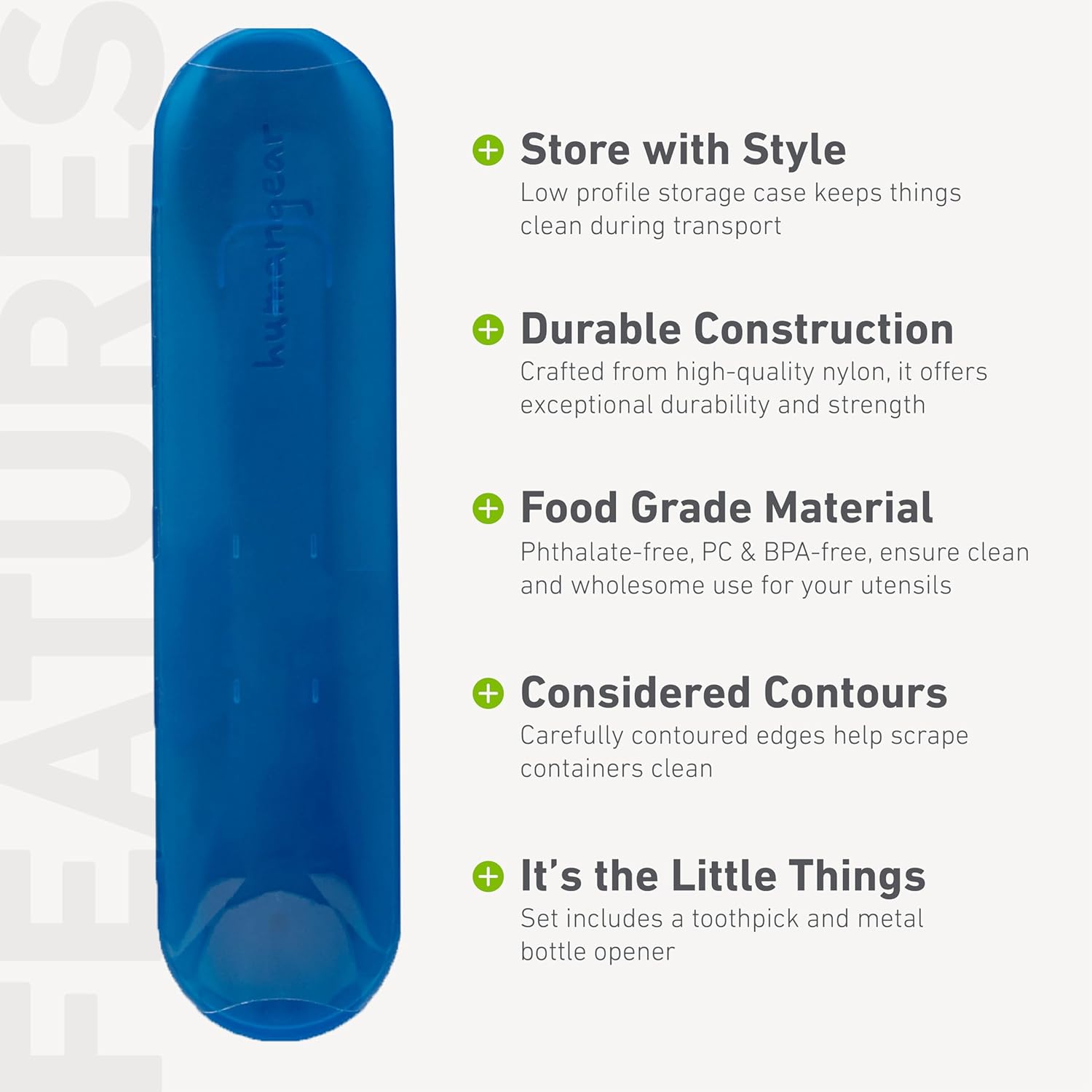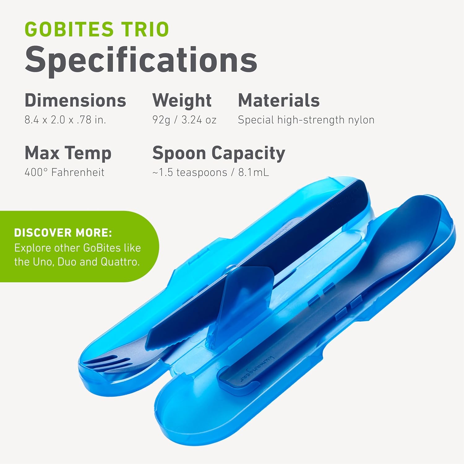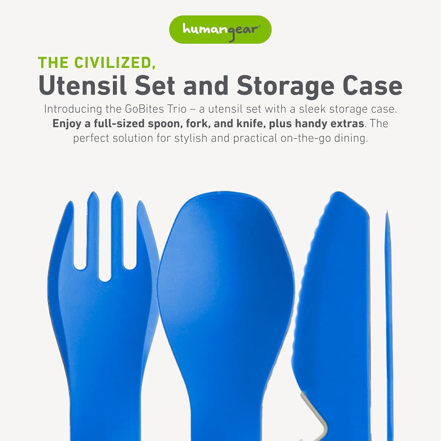 The GoBites Trio is the civilized travel utensil set that’s equally at home in the break room or the backcountry. The low-profile storage case keeps things clean during transport, and the lightweight, durable utensils will stand up to years of abuse. The Trio tools are designed with eating in mind – comfortable to hold but robust enough for serious eating. The knife blade has sharp serrations to cut a piece of chicken and the fork tines are long enough to twirl spaghetti. There are no hidden nooks and crannies where food can build up, so GoBites are a breeze to keep clean. Handy touches like an included toothpick and a metal bottle opener embedded in the knife round out the set. The Trio utensils are made from high-temp nylon that’s incredibly strong. The case is made from food-safe #5PP. All parts are BPA-free, PC-free, Phthalate-free, and dishwasher safe (top rack).