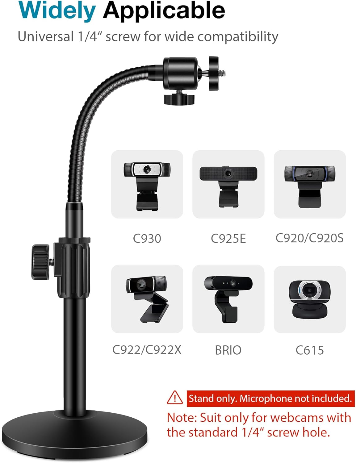 Metal tripod head with standard 1/4″ screw thread, fits multidevices with standard 1/4″ screw hole, especially for Logitech Webcam C920, C920S, C922x, C615, C922, C925e C930 C930e, and etc (expect for Logitech Webcam C270 C310). This webcam stand is also widely used for Zoom and Tascam recorder.