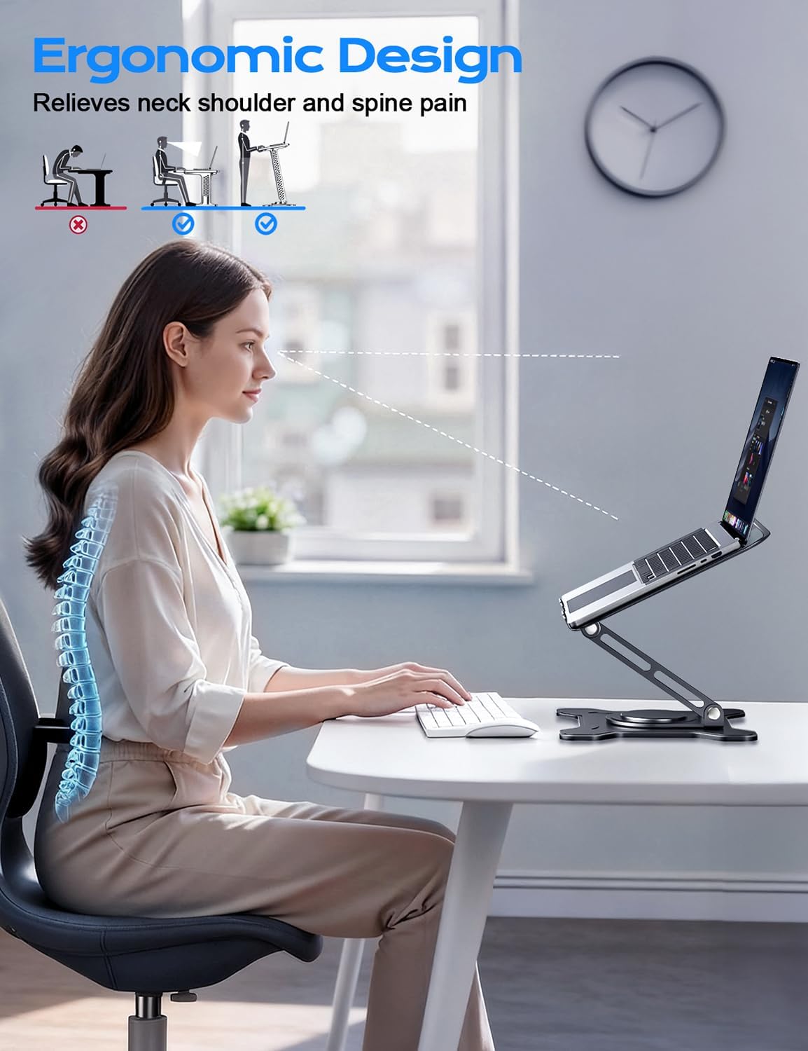 360° Swivel Flexibility: Effortlessly rotate your laptop 360° with a smooth dual-axis base, perfect for sharing screens, presentations, or adjusting to any angle. This unique feature enhances collaboration and transforms your workspace with unparalleled versatility