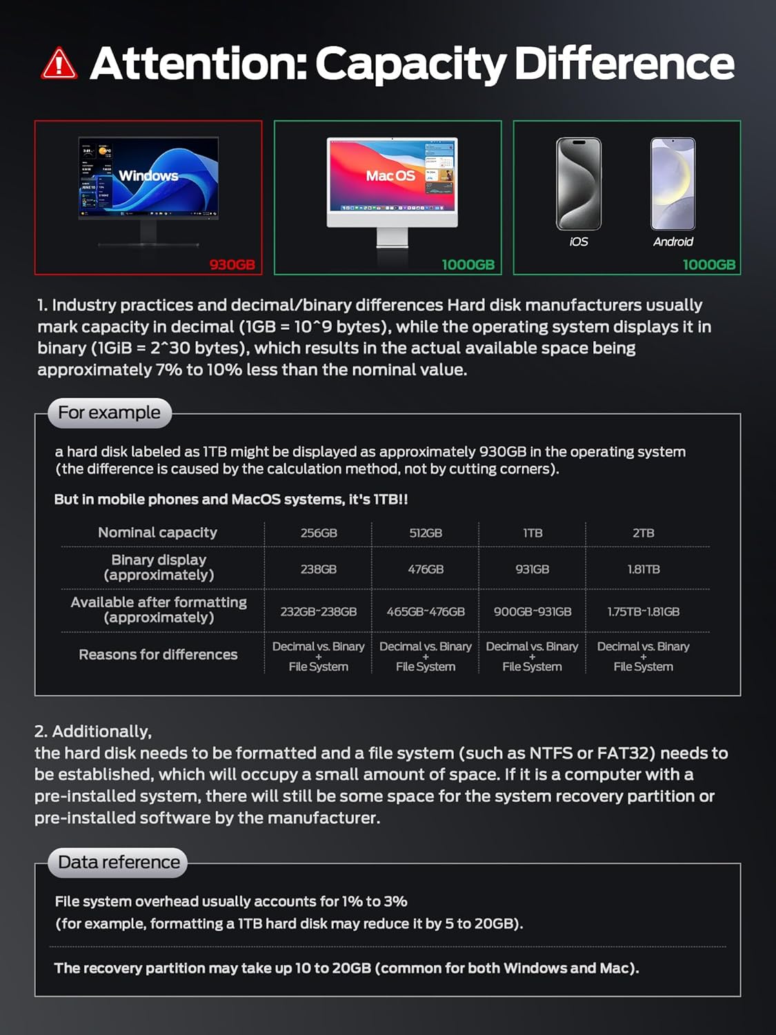 【Attention】–The 1TB hard drive you purchased is calculated by the manufacturer in decimal (1TB=1000GB), but the computer displays it in binary (1TB≈1024GB), so the system will show approximately 931GB. In addition, formatting will occupy a small amount of space, and the final available capacity is approximately between 900GB and 931GB. This is a normal phenomenon for all hard disks and not a quality issue. The same is true of international brands.