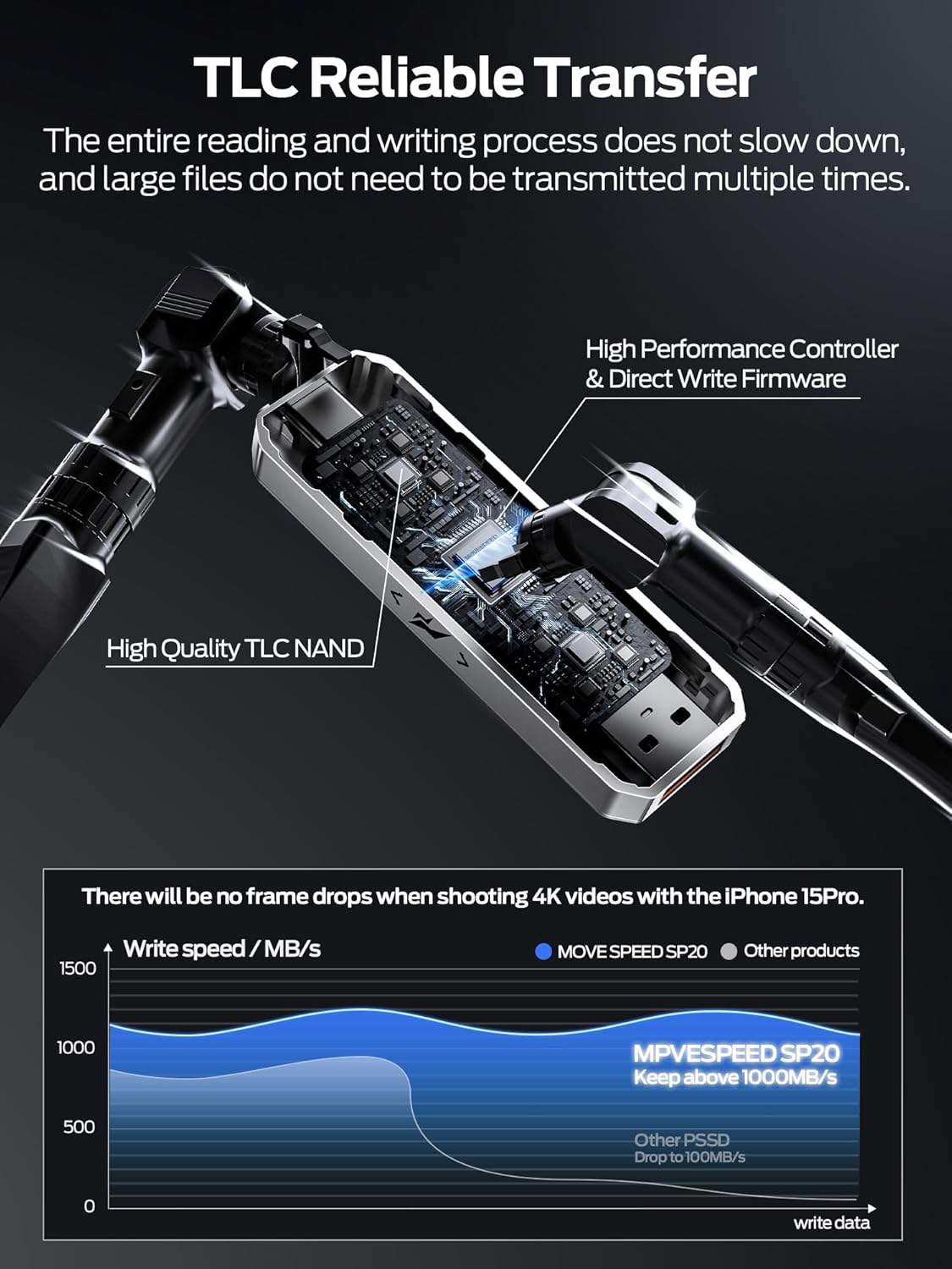 【TLC Reliable Transfer】When continuously transferring large files (>100GB) or playing games, TLC can stably and continuously transfer content, maintaining speed throughout the process and ensuring security. This makes you more comfortable and passionate about PSSD
