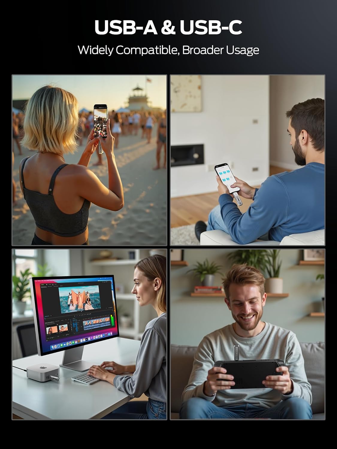 【Dual Interfaces】The USB A (1000MB/s)interface is for computers, and the type-C (2100MB/s) interface is for mobile phones (iPhone 15pro) or computers. Dual interfaces make data transfer between different devices more convenient, thus freeing you from cables and software, allowing you to easily switch storage Spaces and no longer worry about storage issues