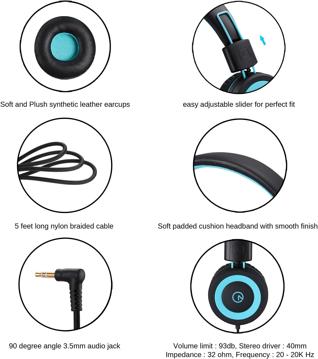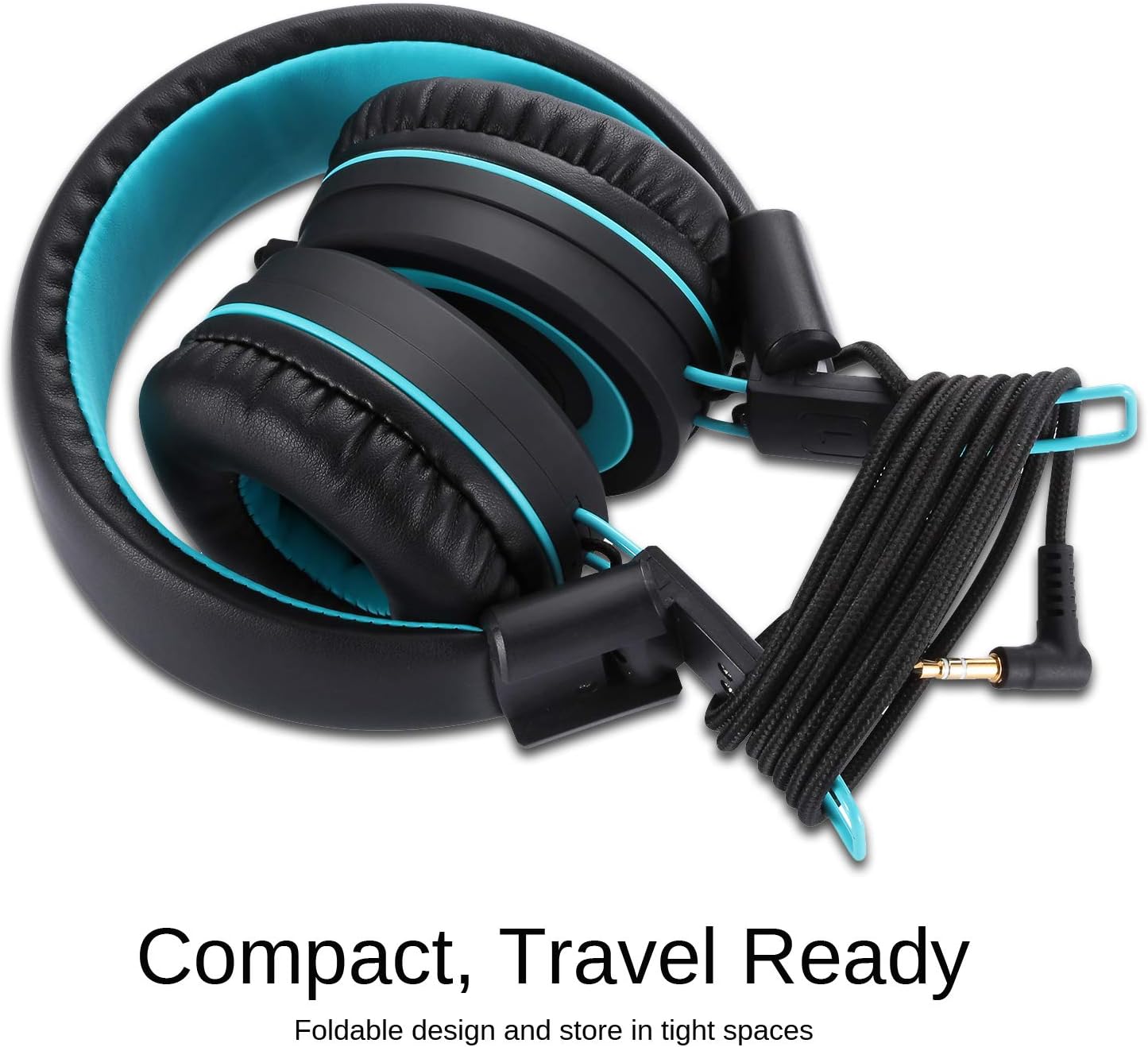 Designed for kids ages 3 to 16, little or older kids, girls, boys, children, toddlers, home/online school, training, long airplane or car rides. On-ear wired headphones have padded soft cushions with a semi-gloss finish for a comfortable fit. The headband is adjustable and flexible to fit most head sizes. The headphones can also be folded in, making it small and compact for easy storage. The cord is a 5 feet long durable nylon braided cable that prevents tangling.