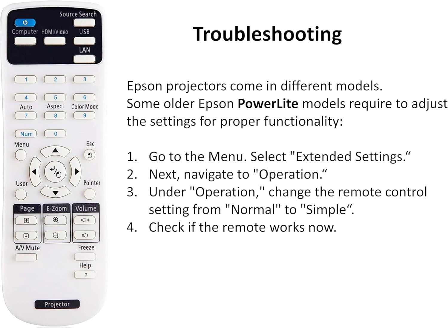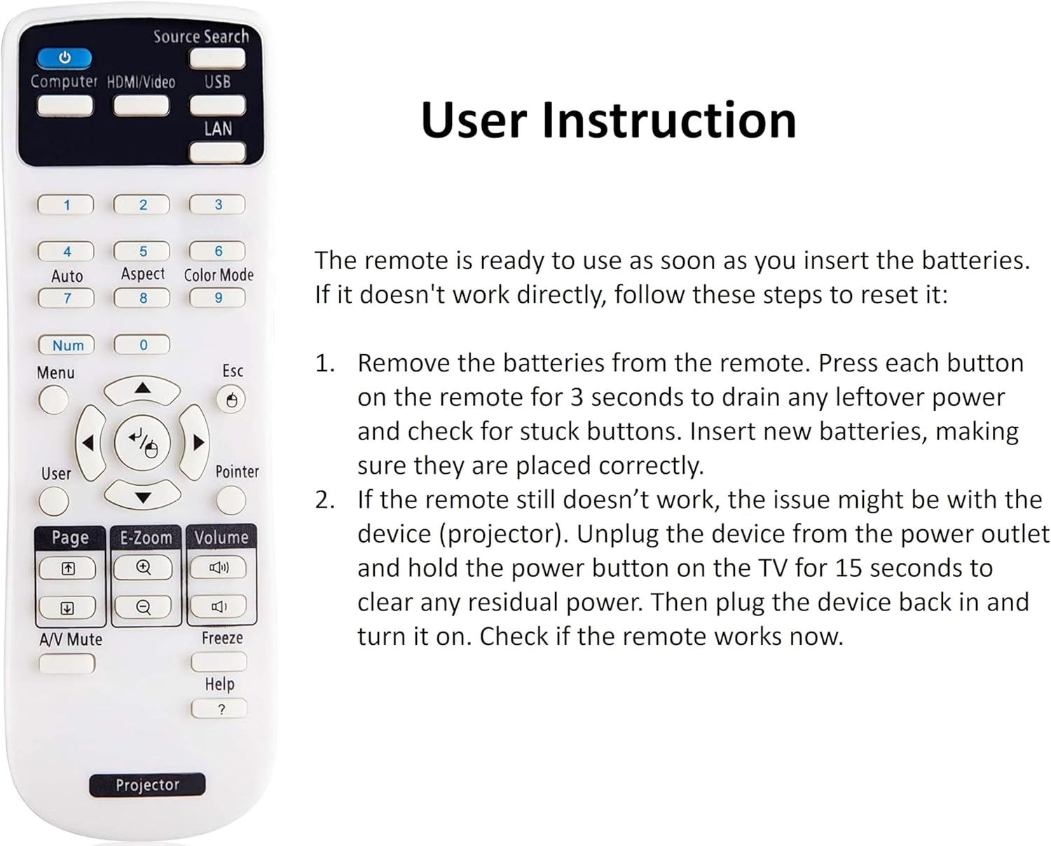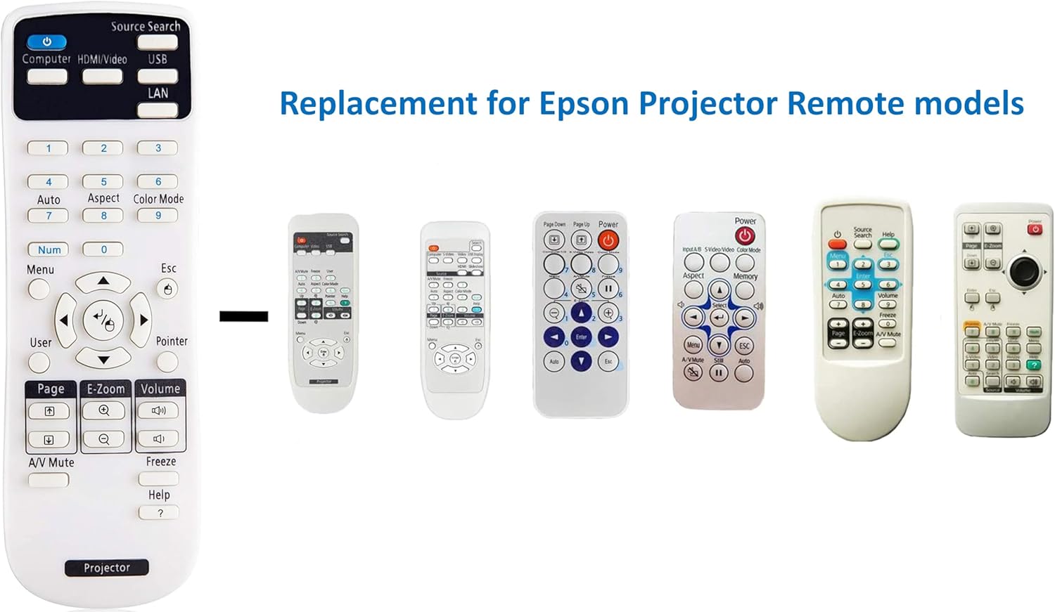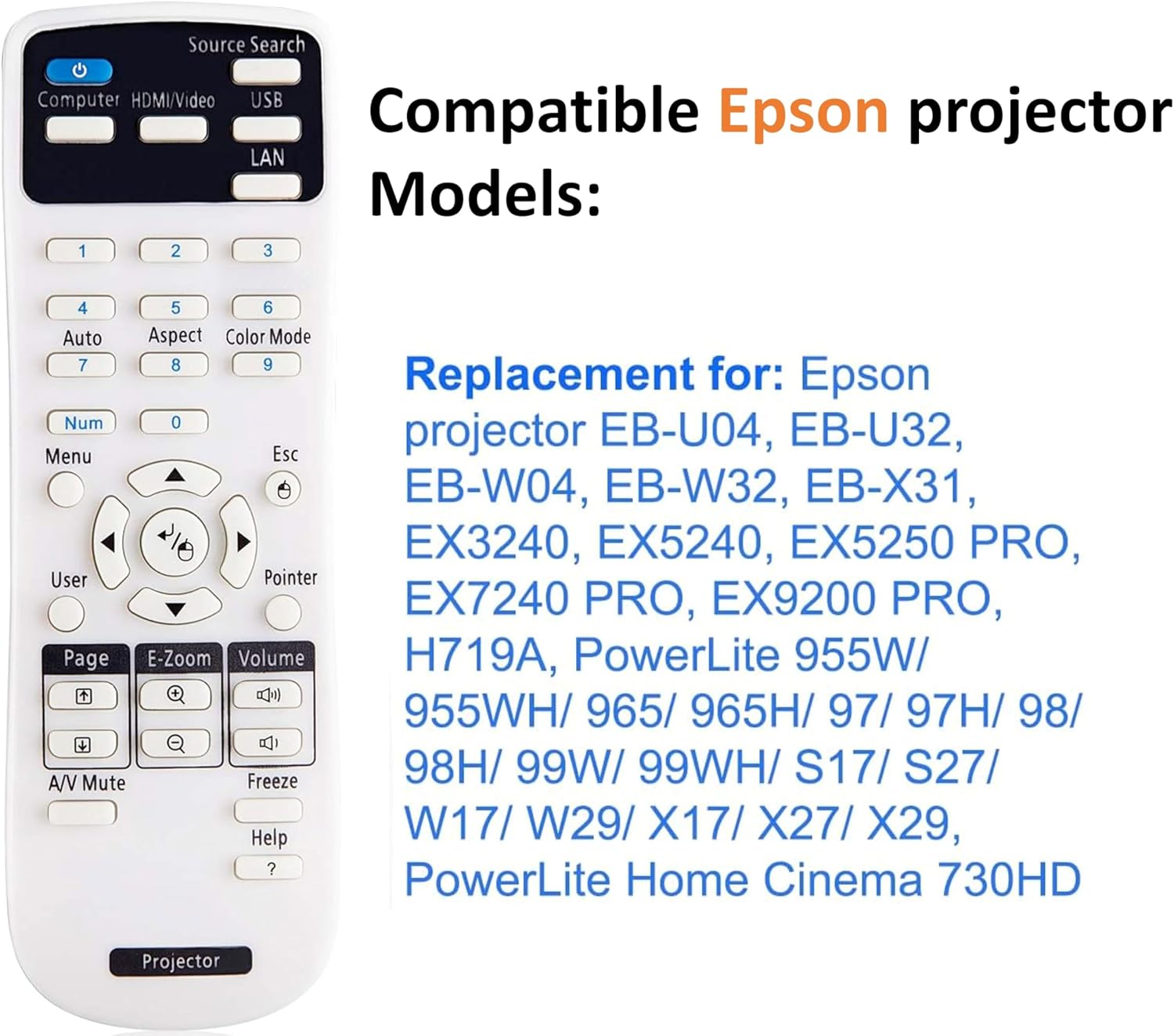 Projector Remote Control for Epson Projectors Home Cinema EB EMP EX VS H BrightLink Powerlite Series Compatible Models: For Epson Home Cinema Series: Home Cinema 2100 2150 1060 660 760hd 2040 1040 2045 740HD 640 2030 2000 730HD 725HD 600 640 500 707 710HD 750HD 705HD 700 For Epson Powerlite Series: PowerLite X39 S39 W39 107 108 109W 1266 1286 2042 2142W 2247U 970 980W 990U 580 585w 570 575W 520 525W 530 535W 1222 1262W 1263W 1284 965 97 98 99W HC 2000 HC 2030 HC 725HD HC 730HD S17 S18+ W15+ W17 W18+ X17 X24+ 1940 1940W 1945 1945W 1950 1955 1960 1965 470 475W 480 485W 1221 1261W S11 W16 W16SK X12 X15 420 425W 905 92 93 93+ 95 96W 450W 460 S7 W7 S8+ 79 S9 X9 S10+ 1220 1260 825 825+ 826W 826W+ 84/84+ 85/85+ 822P 83C 400W 410W 822+ 83 400WE+ 83V+ 77C 78 S5 S6 W6 1750 1775W /1760W 1761W For Epson EX Series: EX9210 EX9220 EX3260 EX5260 EX7260 EX3240 EX7240 EX9200 EX5250 EX5240 EX3220 EX6220 EX7220 EX7230 EX7235 EX5220 EX3210 EX3212 EX5210 EX6210 EX7210 EX31 EX51 EX71 EX3200 EX5200 EX7200 EX90 For Epson EB- Series: EB-108 2042 2142W 2247U 960W 970 980W 990U S05 S39 S41 U05 U42 W05 W39 W42 X05 X39 X41 EB-97H 945H 98H 965H 955WH S04 S27 S29 S31 U04 U32 W04 1420Wi 1430Wi 580 580s 585s 585wi 585ws 590wt 590wi 945 955W 965 S17 S18 SXW03 SXW18 W18 W22 X18 X20 X24 X25 1940W 1945W 1950 1955 1960 1965 470 475W 475Wi 480 480E 485W 485Wi 1410Wi 1400Wi S02 S11 S12 SXW11 SXW12 W02 W11 W12 W16 X02 X11 X12 X14 X15 420 425W 905 93 93e 93H 95 96W 2020 2060 440W 450W 450Wi 455Wi 460 460i 465i S10 S7 X7 S72 X72 S8 X8 S82 W7 W8 X8e S9 S92 W10 W9 X10 X9 X92 824 824H 825 825H 826W 826WH/84/84e/84he/84I/85/85H 410W 410WE 400W 400WE S6 S62 S6LU TW420 W6 X6 X62 X6LU D290 For Epson VS Series: VS250 VS350 VS355 VS240 VS345 VS340 VS230 VS330 VS335W VS210 VS310 VS315W VS320 VS200 For Epson BrightLink Series: BrightLink 536Wi 585Wi 595Wi 575Wi 475Wi 480i 485Wi 425Wi 430i 435Wi 450Wi 455Wi For Epson EMP- Series: EMP-280 270 400 400W 400WE 410W 822 822H 83 77C