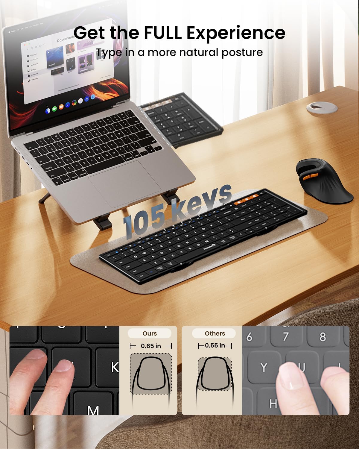 【True Full-Size Portable Keyboard】105 keys with 0.65in keycaps deliver a desktop-grade, precise typing experience – full numeric pad, dedicated function row and precise navigation controls. No compromises for developers, writers, and professionals working from a café, co-working space, or home office(Keyboard is flat, NO TILT)
