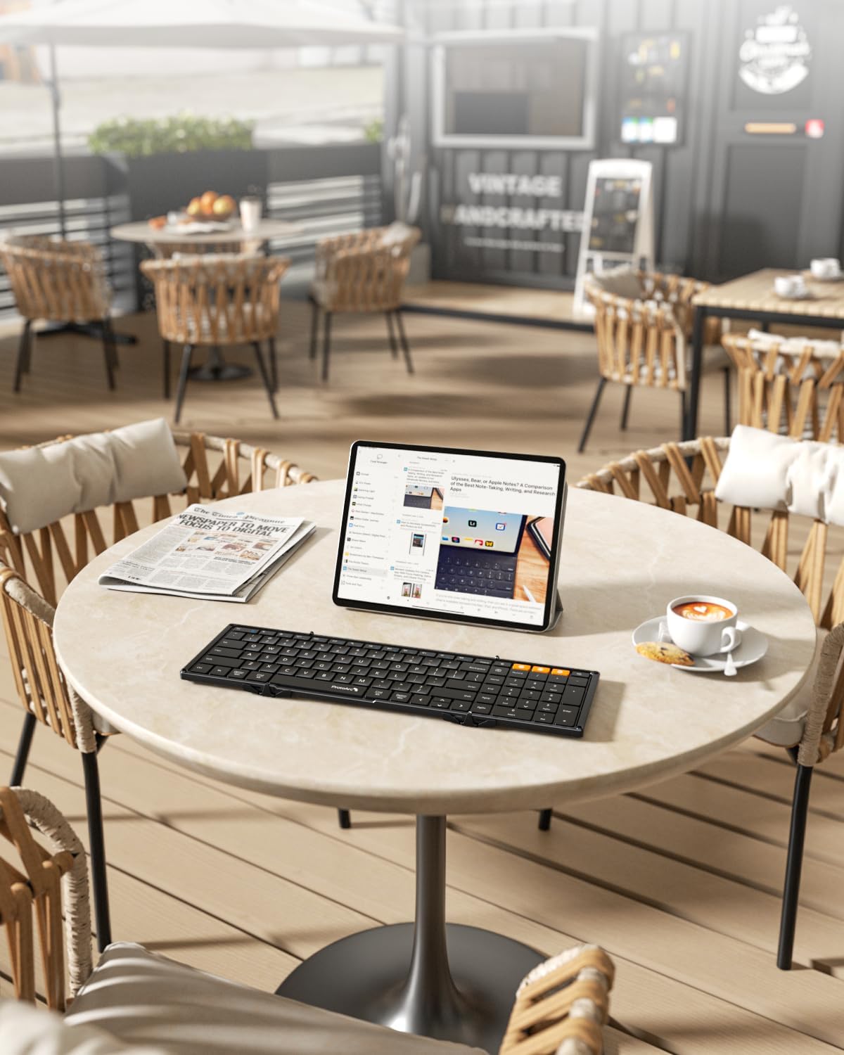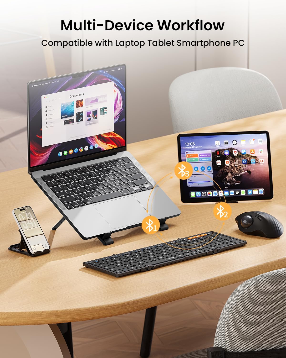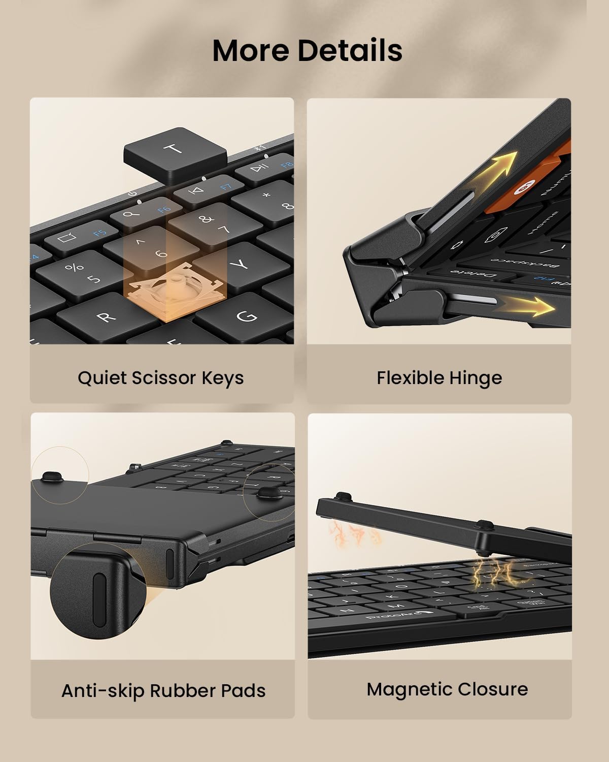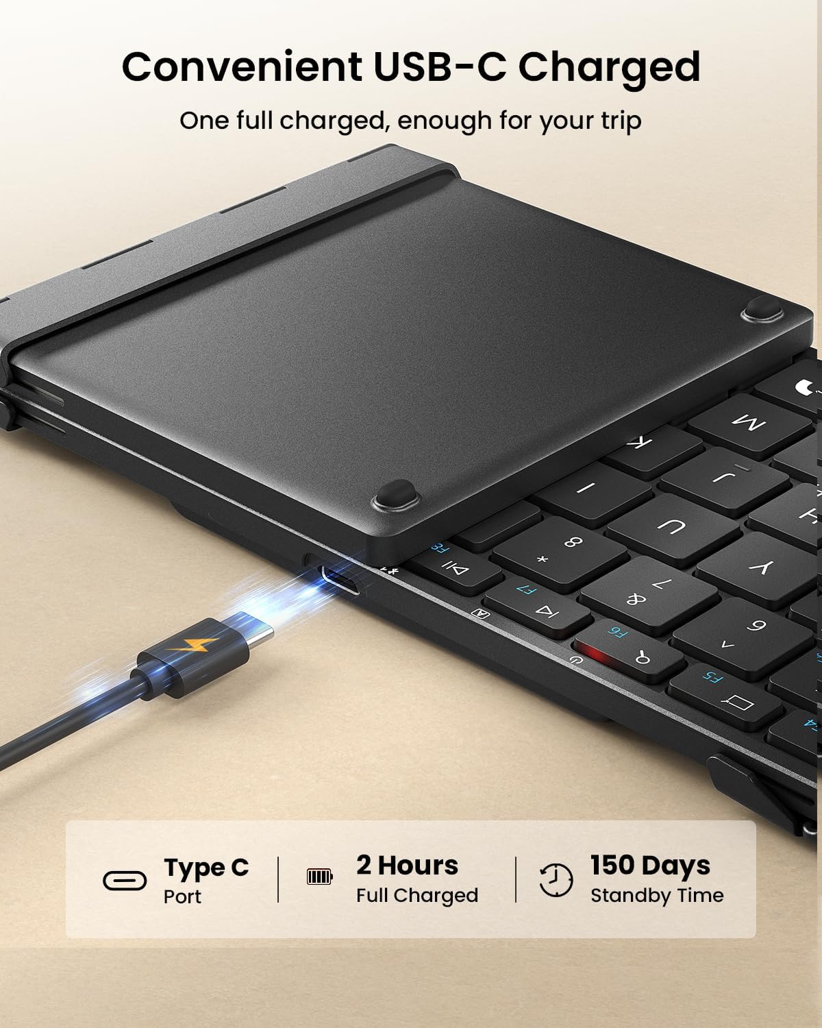 【Long-Lasting USB-C Rechargeable】Quick recharge via the included USB-C cable(not for connecting). The travel keyboard features an auto-sleep function extends standby time to 150 days. That means less time charging and more time being productive