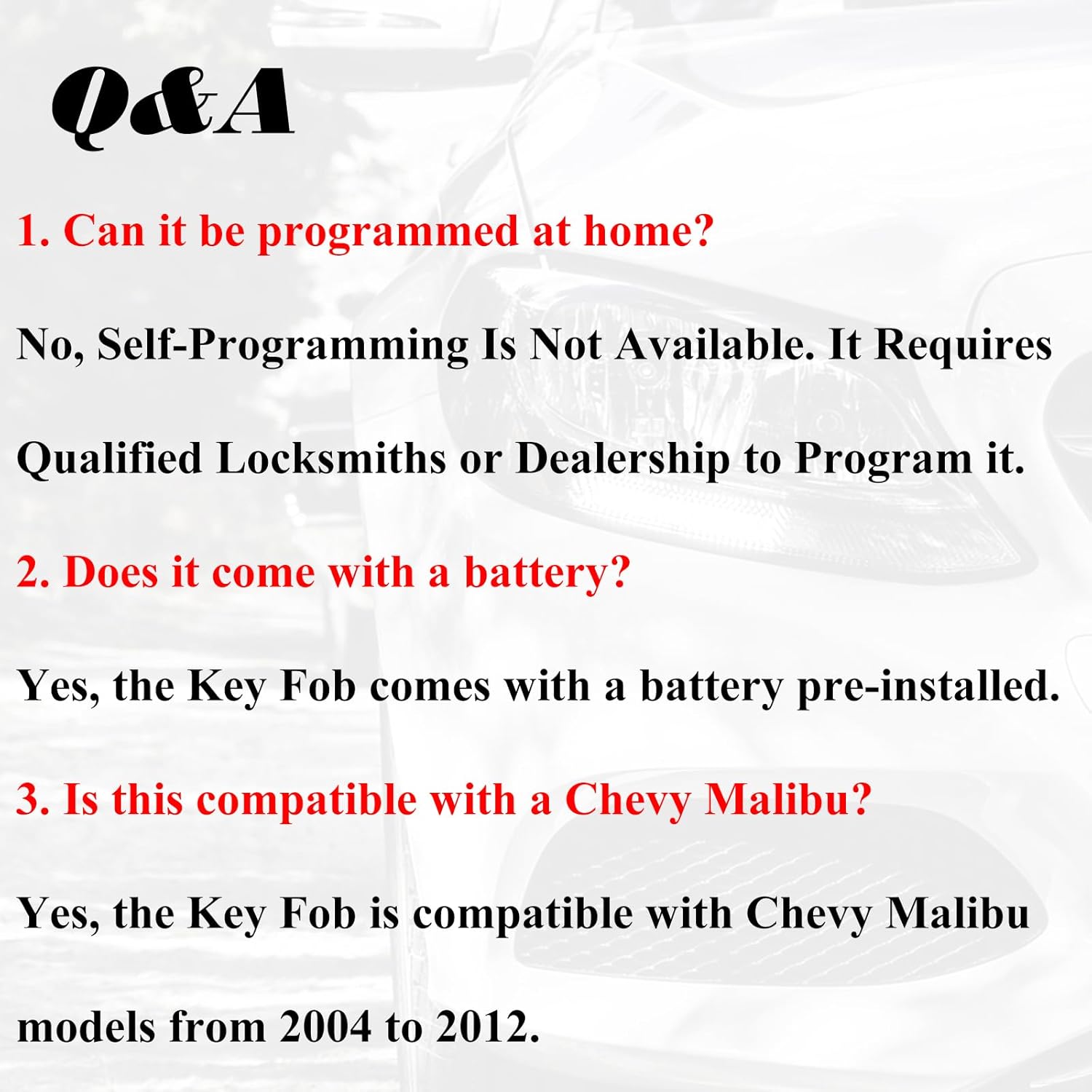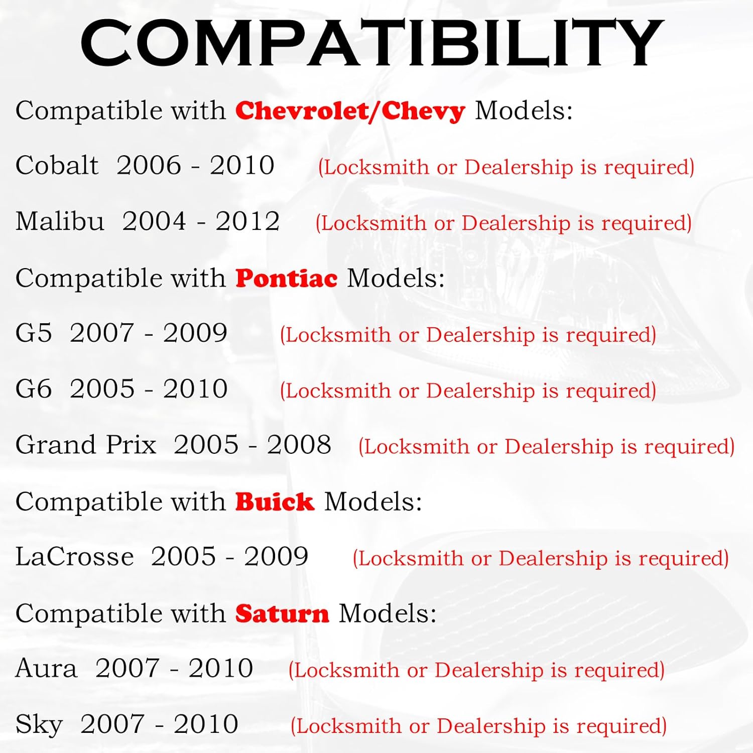 Compatible with Chevy Models Cobalt 2006 2007 2008 2009 2010 ( A Locksmith or Dealership is required ) Compatible with Chevy Models Malibu 2004 2005 2006 2007 2008 2009 2010 2011 2012 ( A Locksmith or Dealership is required ) Compatible with Pontiac Models G5 2007 2008 2009 ( A Locksmith or Dealership is required ) Compatible with Pontiac Models G6 2005 2006 2007 2008 2009 2010 ( A Locksmith or Dealership is required ) Compatible with Pontiac Models Grand Prix 2005 2006 2007 2008 ( A Locksmith or Dealership is required ) Compatible with Buick Models LaCrosse 2005 2006 2007 2008 2009 ( A Locksmith or Dealership is required ) Compatible with Saturn Models Aura 2007 2008 2009 2010 ( A Locksmith or Dealership is required ) Compatible with Saturn Models Sky 2007 2008 2009 2010 ( A Locksmith or Dealership is required )