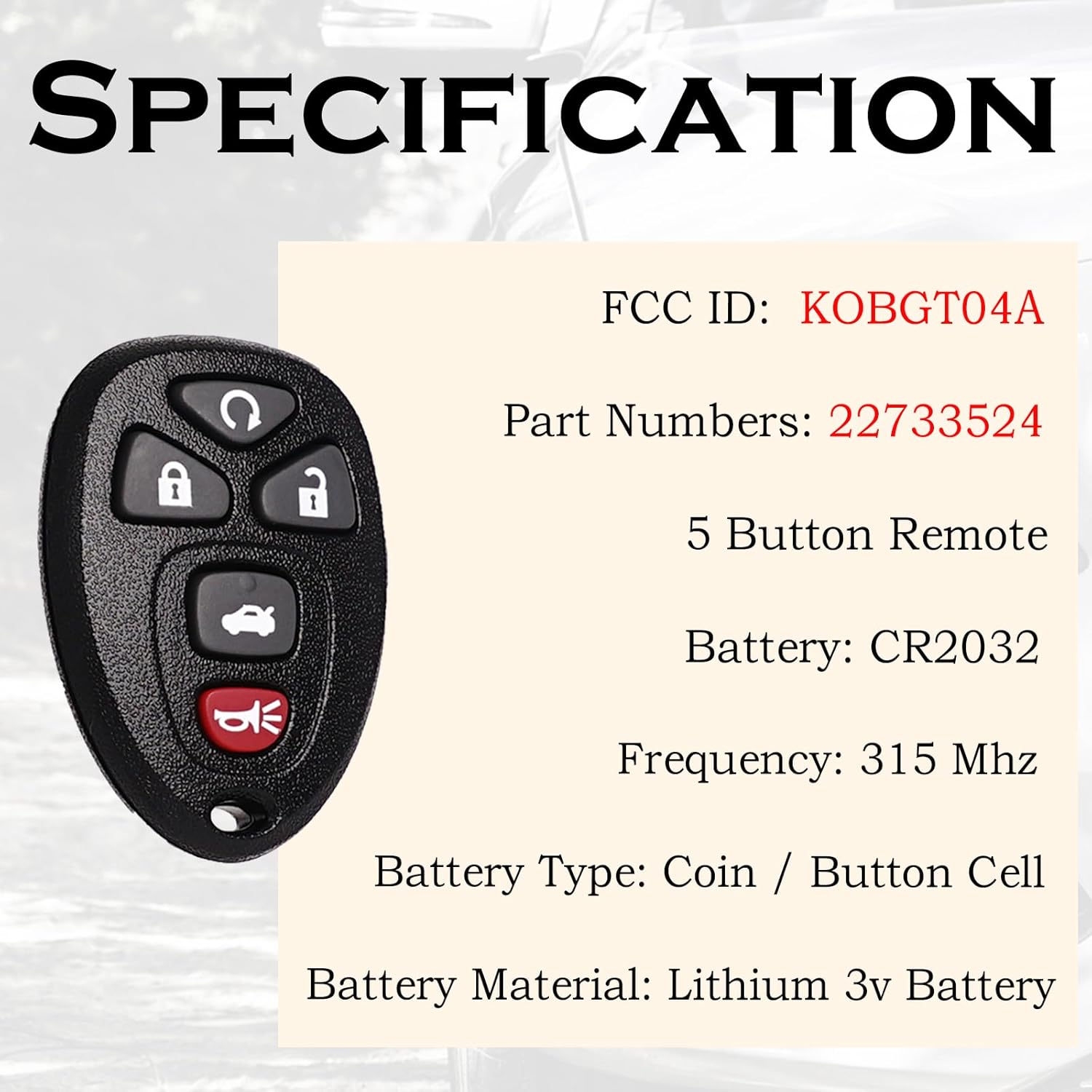 COMPATIBILITY: Compatible with FCC ID KOBGT04A. Please Check Our Product Description and Vehicle Fitment Tool for Full Compatible Vehicles List. This Remote Key Fob Replacement Is Compatible with Chevrolet Chevy Cobalt 2006-2010 Malibu 2004-2012 Pontiac G5 2007-2010 Grand Prix 2005-2008 Buick LaCrosse 2005- 2009 Saturn Aura Sky 2007-2010