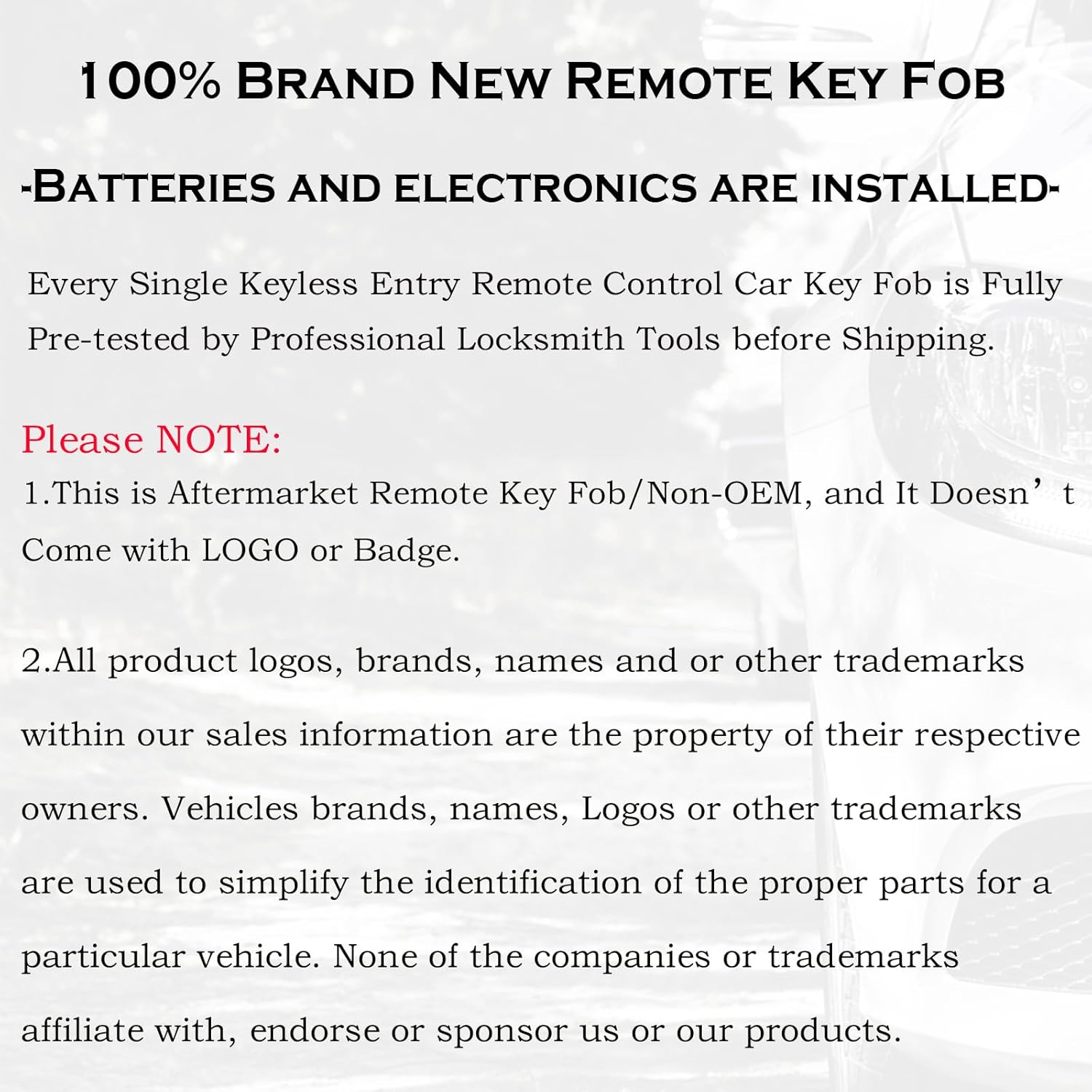 HIGH-QUALITY: Every Single Keyless Entry Remote Start Control Car Key Fob is Fully Pre-tested by Professional Locksmith Tools before Shipping. All Our Key Fobs are Pre-installed with Battery and Electronics.