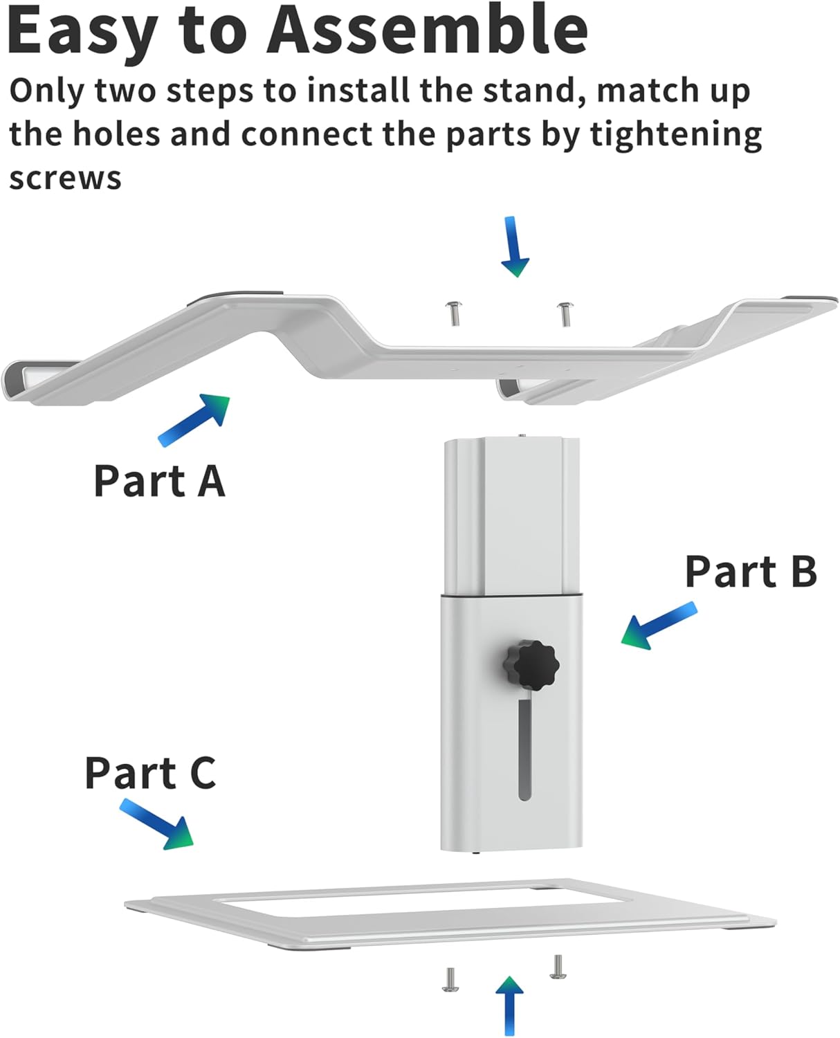 Protective and Easy Installation – The silicone pads on the surface keep your laptop stay in place and protect your device from scratches. BTW, it just need two steps that you can install the stand, match up the holes and connect the parts by tightening screws.