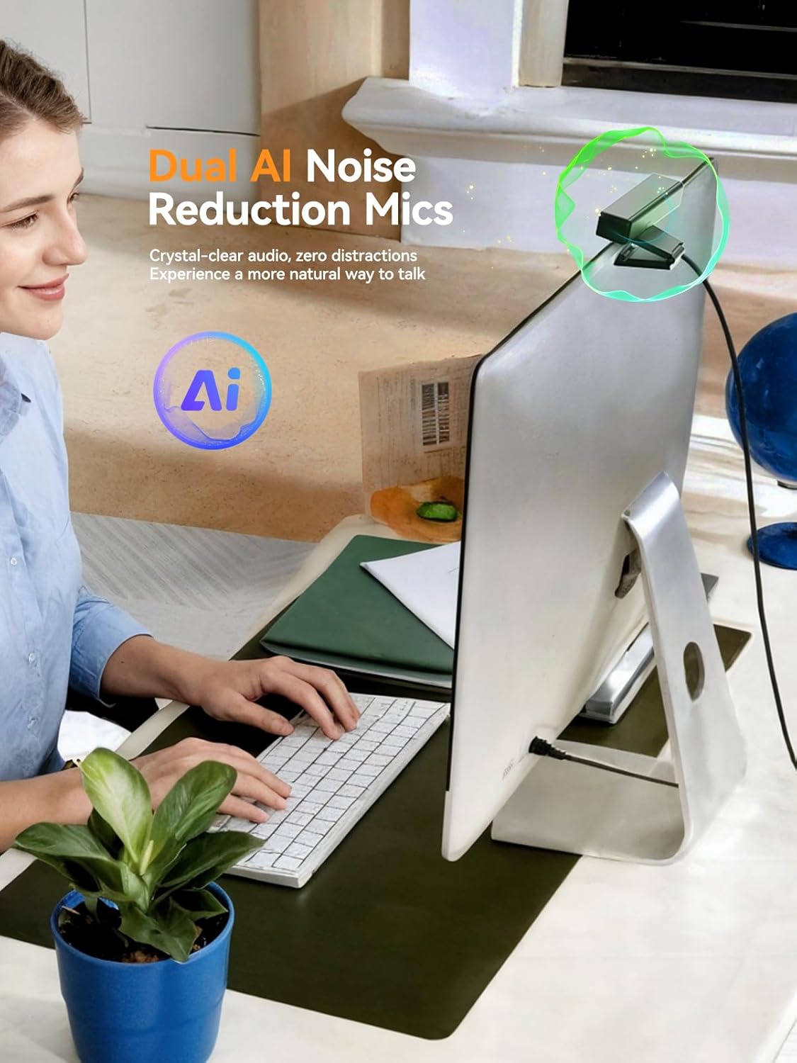 【AI Background Noise Canceling Mics】The built-in dual stereo microphones use AI background noise reduction technology to filter out standard office and home noise. With a long-range pickup of up to 16 feet (5m), it ensures your voice is heard clearly and naturally during online conferences, online teaching, or video chats.