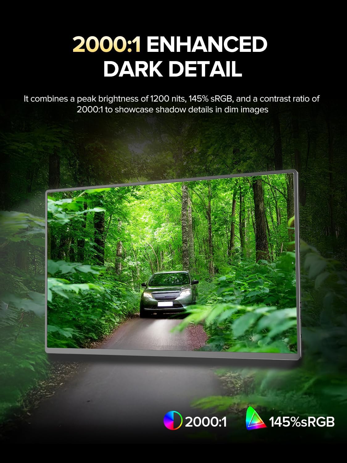 2000:1 High Contrast Ratio: White is 2000 times brighter than the darkest black, and this portable screen turns every scene into a dramatic visual masterpiece. Shadows reveal hidden details, highlights burst with luminous intensity, and colors gain unparalleled dimensions, immersing oneself in more realistic, rich, and lifelike images