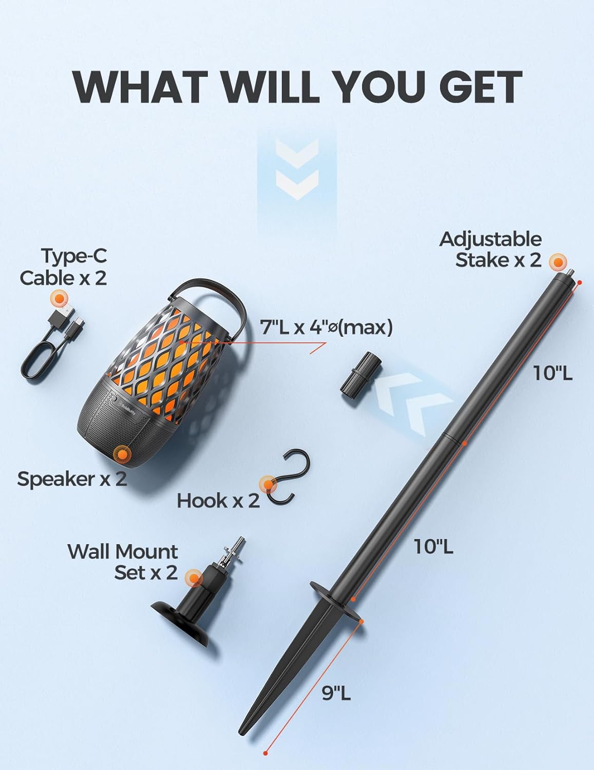 3-Mode 360° Light Show – The LED portable speakers also work as an independent LED atmosphere lamp, patio light, or portable lantern. You can switch between flickering flame light, breathing candlelight, and solid amber light, or simply turn the light off. A pair of hooks, ground stakes, and wall mounts are included for convenient placement