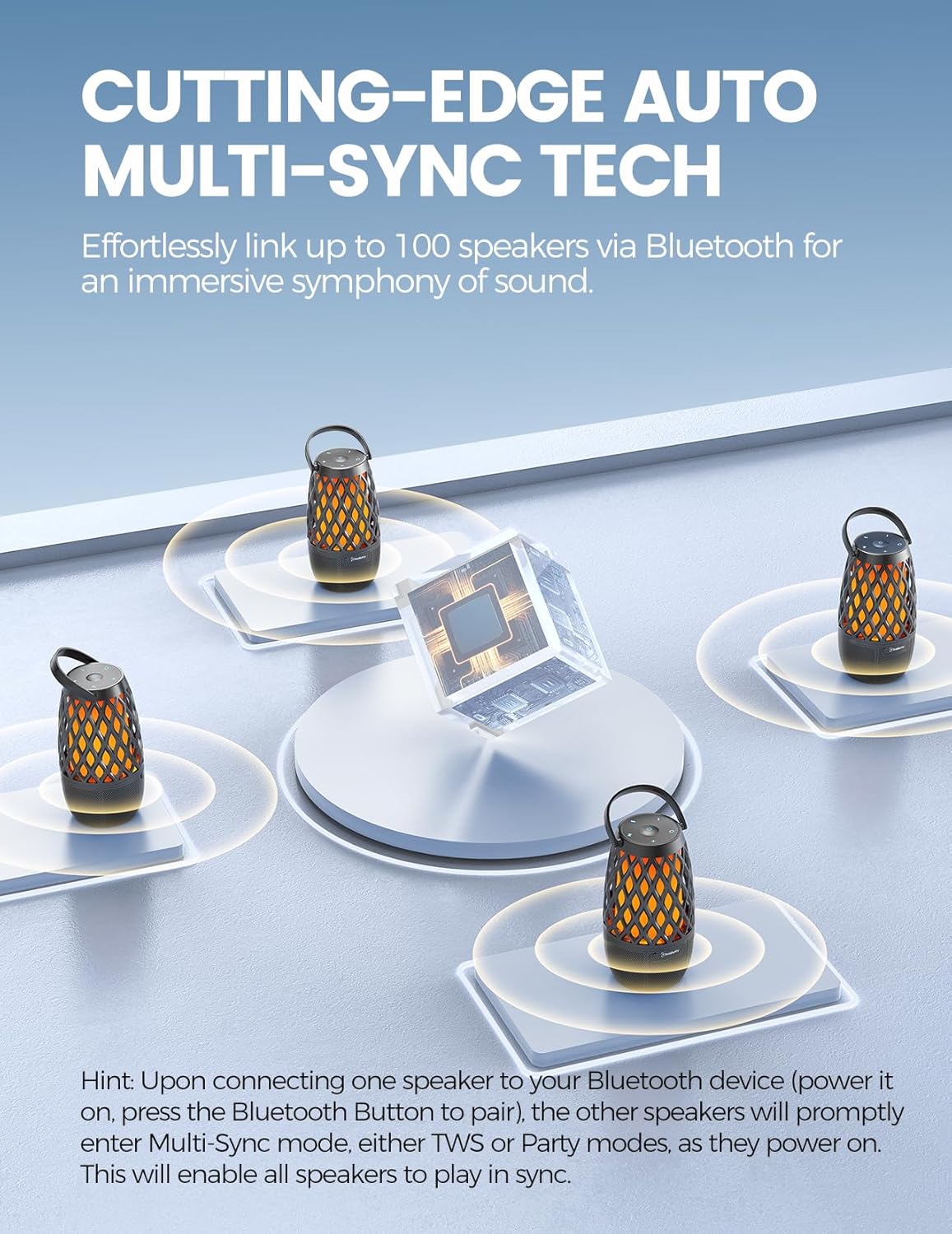 Astonishing Surround Sound – Bluetooth 5.0 and its built-in DSP technology ensure a well-balanced sound experience with great clarity. Need more vibes and space-filling sound for parties or outdoor events? You can pair up to 100 flickering flame Bluetooth speakers together and synchronize music playback across them to get a more immersive and 360° surround sound experience